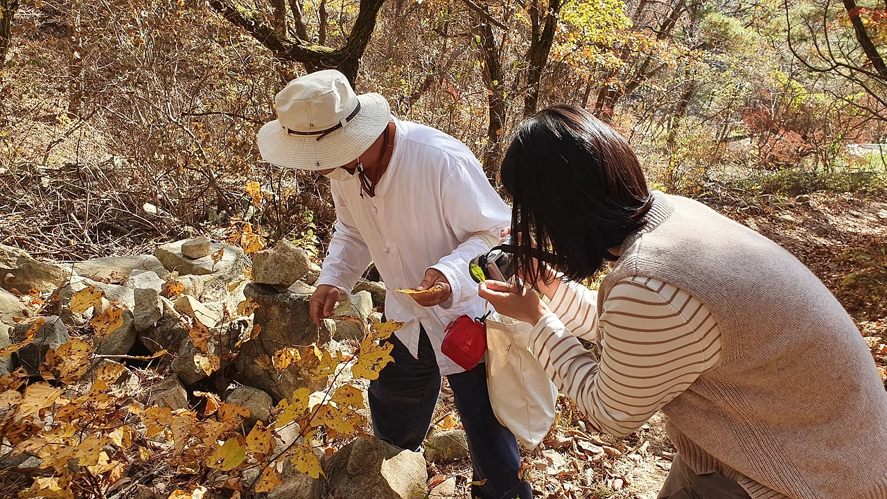 치유를 끝낸 뒤엔, 숲 속 찻자리가 펼쳐진다. 숲치유 선생님이 손수건과 꽃을 주섬주섬 꺼내시더니,