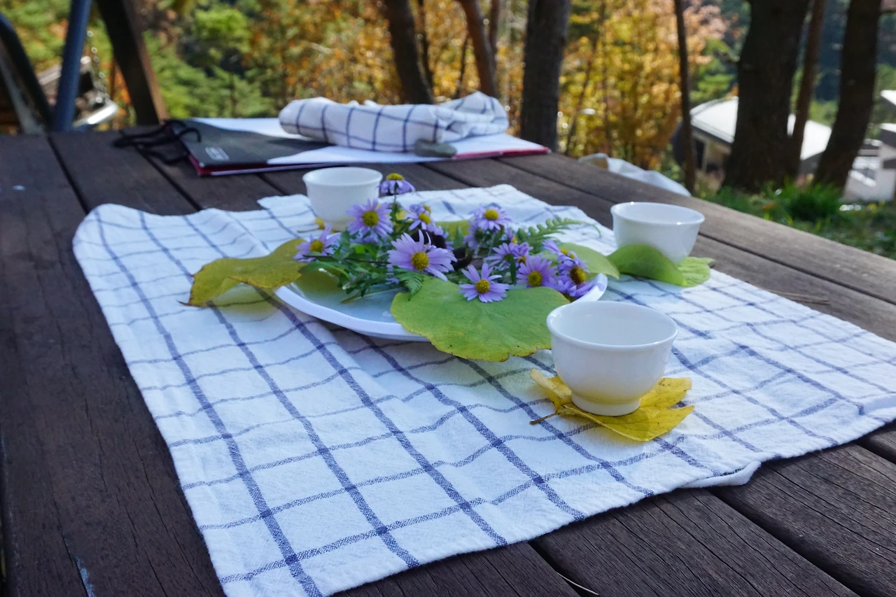 쓱- 하고 테이블 위에 꽃과 함께하는 차를 준비해주신다. 오도산 찻자리에서는, 나뭇잎이 찻잔을 대신하고,