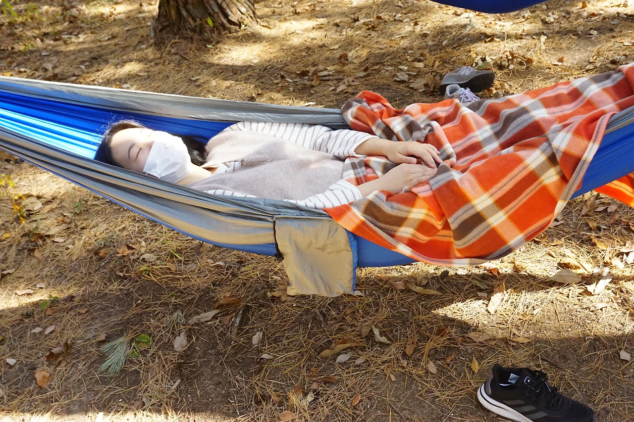 숲치유 선생님이 나눠주신 거울을 사용해 그전에 보지 못했던 숲의 하늘을 바라보기도 하고, 나무들에 대해 알아간다. 해먹에 누워 숲에서 피톤치드향 맡으며 가만히 쉬고 있노라면, 그야말로 평화롭다. 이보다 더 평화롭고 고요한 시간이 있을까? 숲을 걷는 것과는 또 다른, 온전한 쉼과 치유가 가능하다.