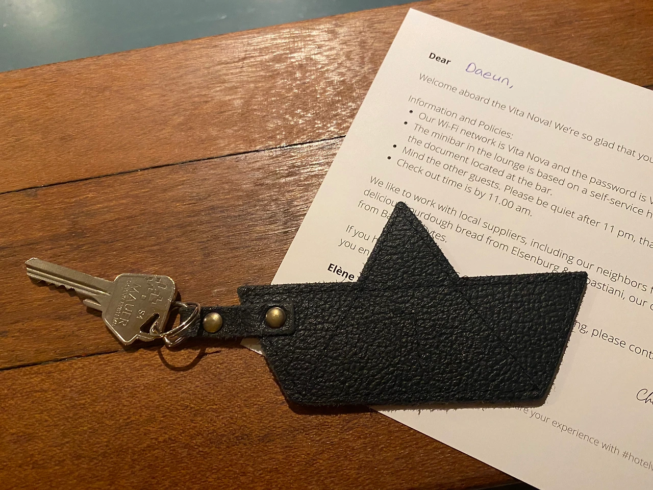 공용 공간에 안내문과 함께 객실 키가 놓여 있다.