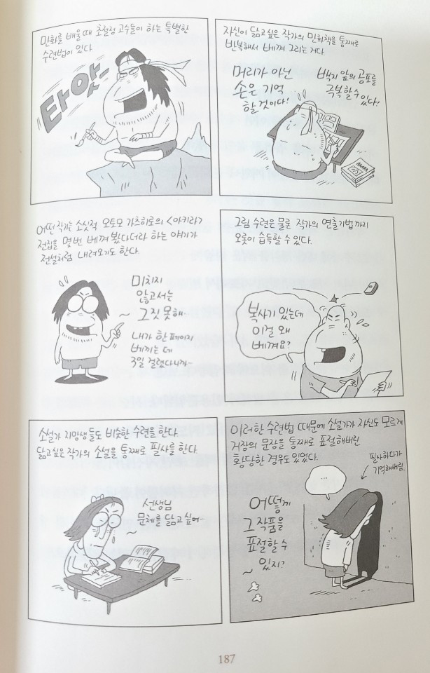 하고 싶은 건 하고 봐야 하는 못된 성격이라 또 덤벼든다. 뒹굴거리는 내 캐릭터 하나 만들 때까지. SNS에 올리는 사진이 최소한 실제에 가깝게 보이는 정도까지는 노력해 보자. 모방이라 부르고 배움이라 쓴다. 현실은 원작 훼손에 가깝지만 이것도 하다 보면 비슷하게는 그리는 날이 오겠지. <표현의 기술>에는 만화가 정훈이 님의 그림도 곁들여져 있다. (이건 도무지 어떻게 옮겨야 할지 몰라 사진으로 찍었다.)
