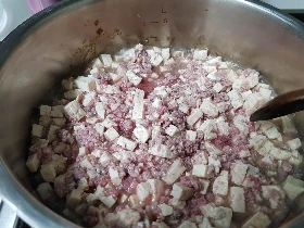 3. 냄비에 소고기와 두부를 넣고 볶아주세요.