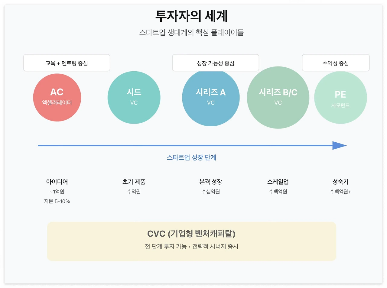 투자 생태계도 마찬가지다. VC, AC, PE, CVC는 모두 '투자자'라는 큰 범주에 속하지만, 실제로는 각각 다른 목적, 다른 시기, 다른 방식으로 스타트업과 관계를 맺는다.