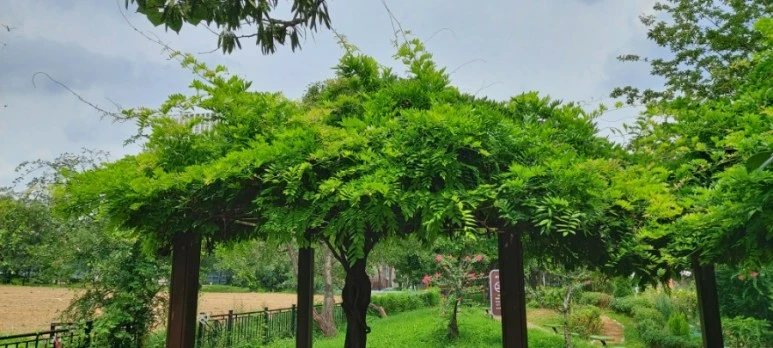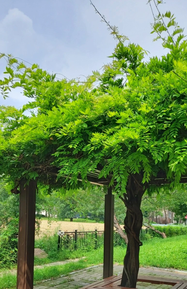 늦여름의 초록을 만끽하며 천천히 걸었다. 그러다 갑자기 걸음을 멈추었다. 눈앞에 펼쳐진 사진 같은 모습에 시선이 멈추었다. 순간 나도 모르게 시선과 함께 발걸음을 멈추었다. 늦여름 짙은 초록이 풍성한 등나무였다. 5월에 찬란했던 꽃은 떨어지고 잎만 풍성한 등나무는 사람들에게 시원한 그늘을 만들어주고 있었다. 처음에는 등나무인지도 몰랐다. 나무 이름표에 등나무라고 쓰여진걸 보고 다시 나무를 보았다. 덩쿨을 이루고 있는 짙은 초록의 등나무였다.
