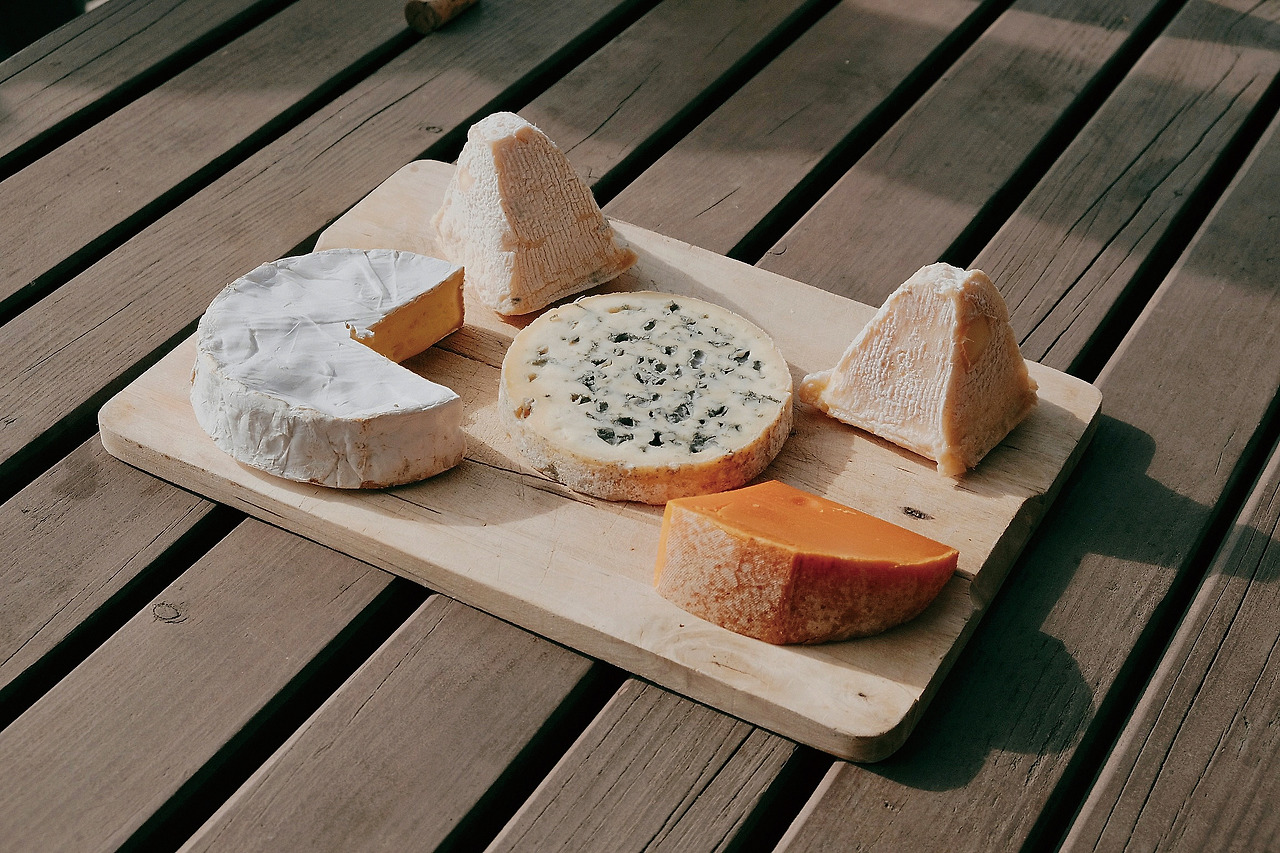 사각뿔 형태의 치즈는 '풀리니 생 피에르(Pouligny Saint Pierre)', 아래 세 치즈는 왼쪽부터 '꿀로미에(Coulommiers)', '블루치즈(Bleu Cheese)', '미몰레트(Mimolette)'입니다.