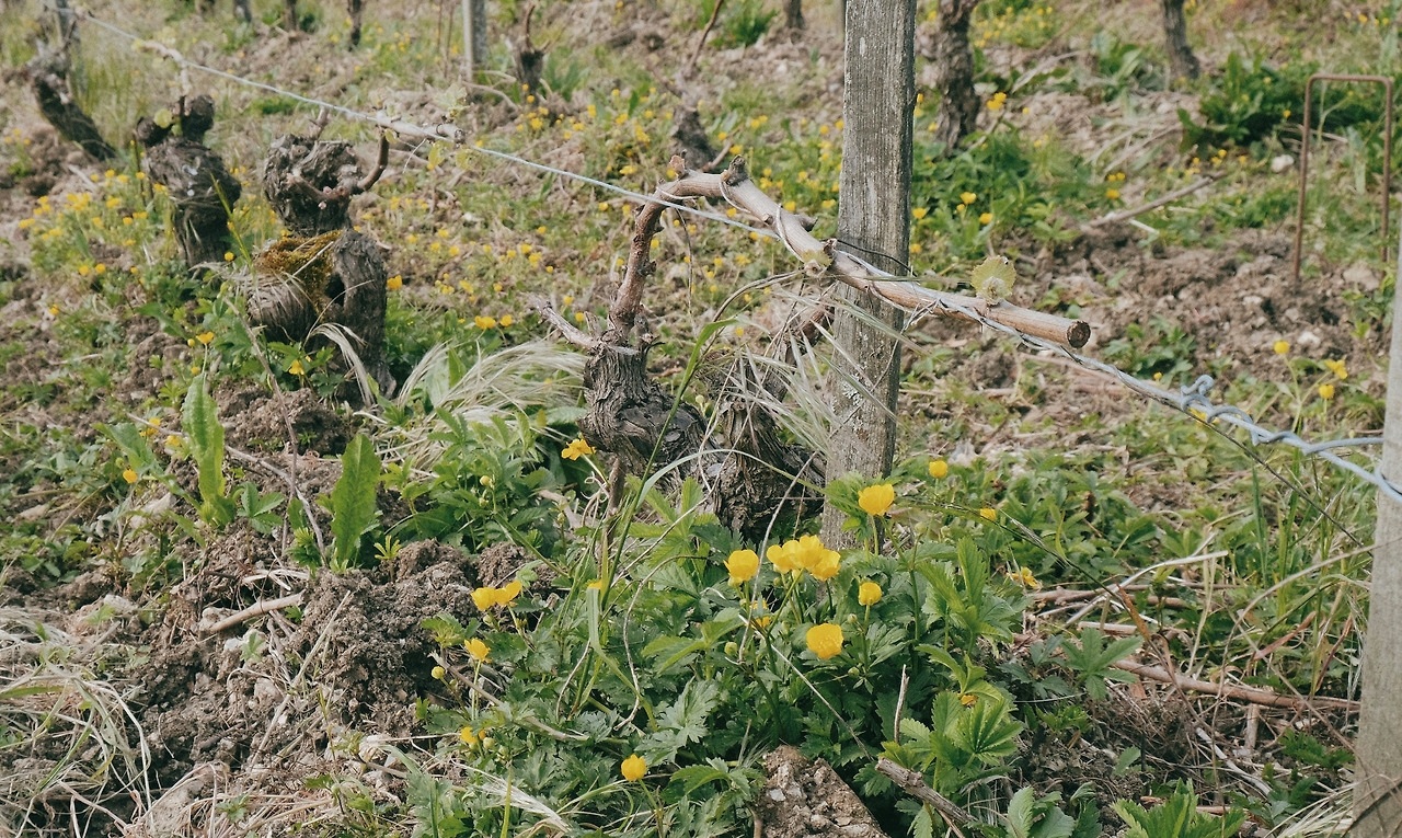 하지만 시간이 갈수록 포도 나무의 뿌리는 깊어지고, 질소와 같은 토양 내 환경이 서로를 정화시키고 지켜주는 역할을 해요. 곳곳에 꽃이 피면 땅속에 있던 아조또(질소)가 표면으로 올라와 버려요. 이때 가벼운 쟁기질로 아조또를 땅 밑에 넣어주는 정도로 보면 돼요. 그리고 곳곳에 보이는 노란 꽃들은 인위적 비료가 아닌 토양 자체가 가진 천연 비료 덕에 자연스럽게 생겼어요. 땅이 선순환되고 있다는 증거이기도 하고요.