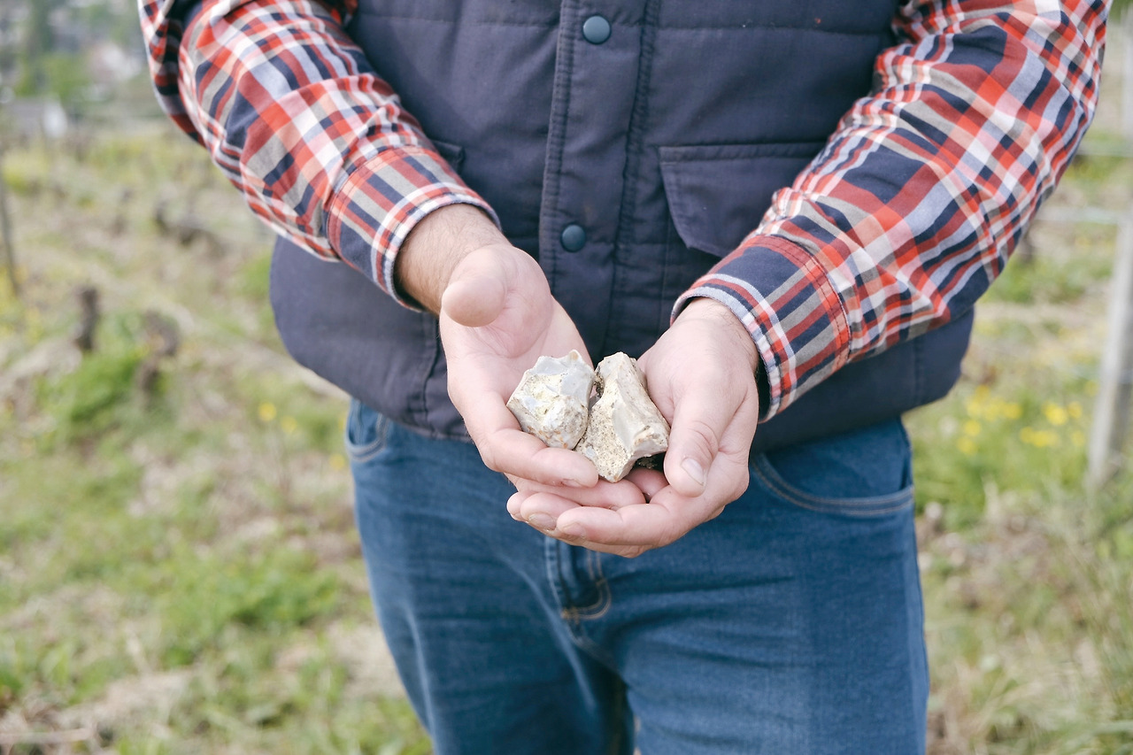 지금 보는 악메닌 밭은 석영 토양으로 구성되어 있어요. 이 돌을 비비면 부싯돌향이 나요. 와인에서 느껴지는 살리니떼(Salinite, 염도)도 이 돌에서 기인하죠. 다른 이야기지만 이 돌이 바로 선사시대 때 무기로 사용한 그 부싯돌(석영의 일종)이에요.