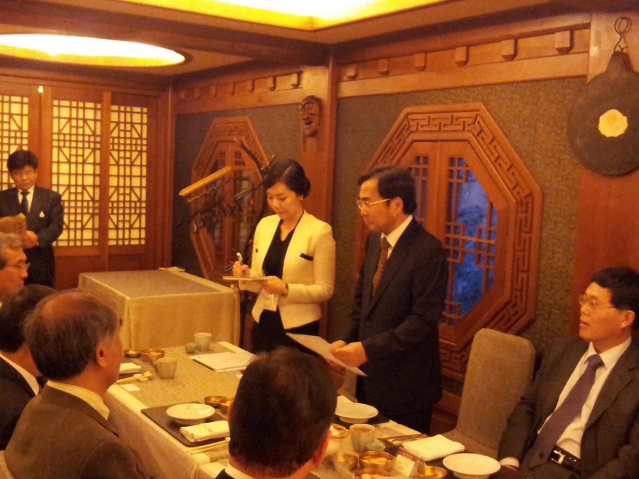 아시아법대학장포럼 통역을 한 날 저녁에는 대법관님 주최 환영만찬이 있었다. 교수님과 이번 행사 총괄을 맡은 난이와 함께 나는 미리 고즈넉한 한식 레스토랑인 만찬장으로 향했다. 만찬 통역을 해야 했기 때문에 나는 저녁을 미리 간단하게 먹고 통역 준비를 했다. 시간이 되어 교수님들께서 도착하셨고, 나는 대법관님이 앉으시는 헤드테이블에 함께 앉았다. 제일 먼저 환영사가 있었고, 대법관님께서도 원고에서 크게 벗어나지 않고 말씀을 하셨기 때문에 비교적 수월하게 환영사 통역을 마쳤다. 문제는 그다음이었다. 공항에서 잠시 이야기를 나눌기회가 있었던 규슈대학의 히데타케 교수님께서 답사를 하실 차례였는데, 자리에서 일어나시더니 갑자기