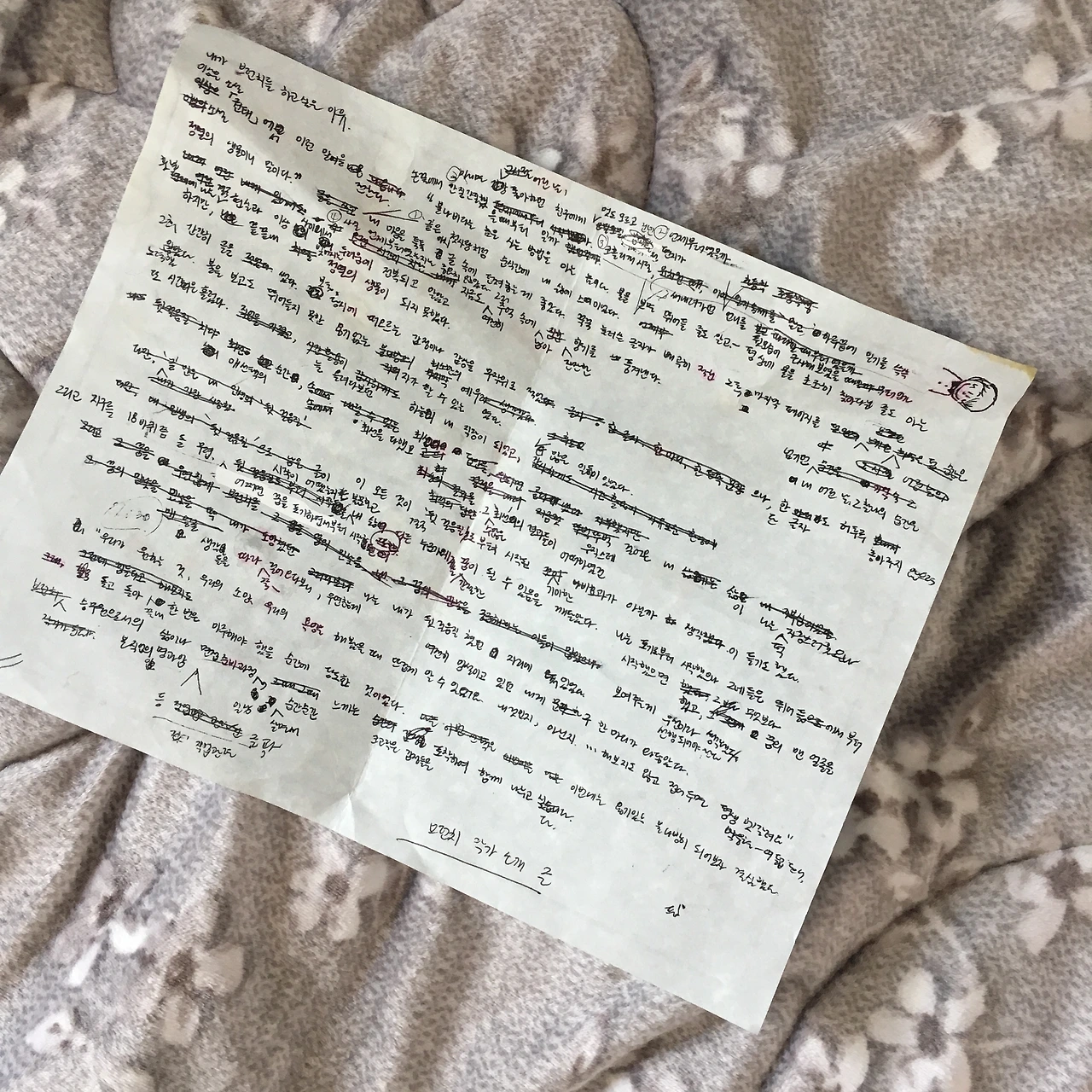 오랜만에 다이어리나 써볼까 싶어 펜 몇 개를 집어 들고 침대에 배를 대고 누웠다. 펼쳐본 다이어리에서 구겨진 종이 한 장이 툭 떨어졌다.