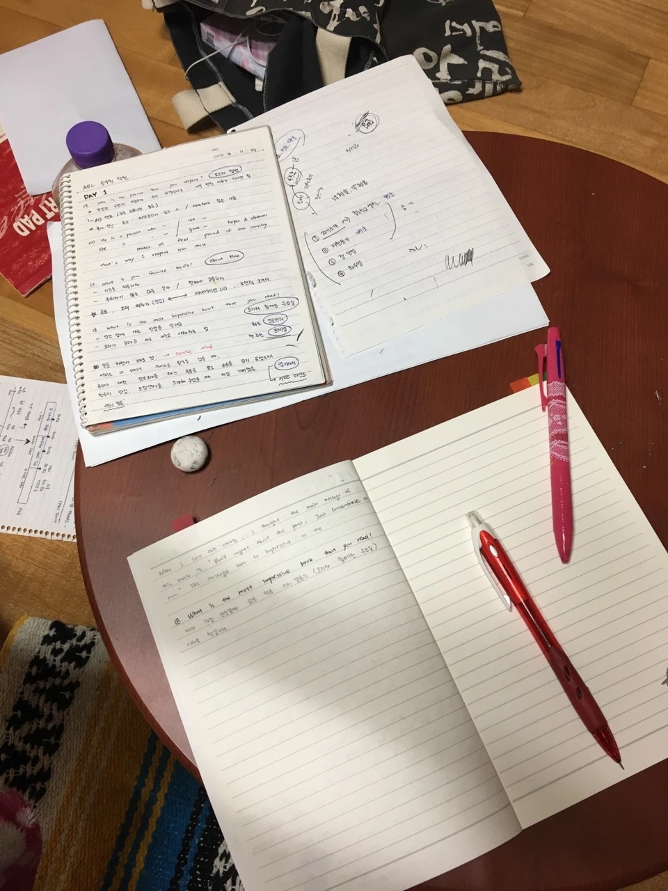 새벽 6시 반 눈을 떠 8시까지 수영을 배우고 돌아온다. 집으로 돌아와 아침밥을 먹는다. 월, 수, 목에는 학원에 갈 채비를 하여 집을 나선다. 정규 수업에 참여하고 학원생들과의 면접 스터디로 하루를 마친다. 나머지 요일에는 집에서 하이힐, 호흡, 미소, 자세, 답변 연습을 한다. 토요일에는 중국어 수업을 듣고 일요일에는 하고 싶은 공부를 한다. 대략적으로는 이렇다.