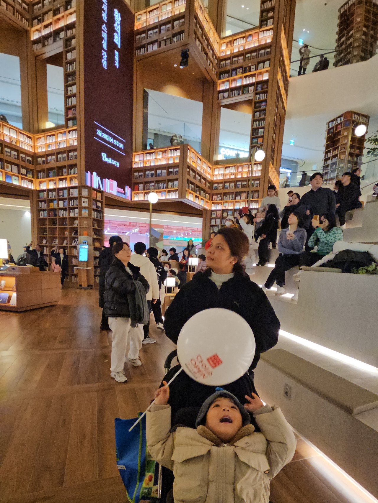 나는 별마당도서관을 배경으로 요한이 사진과 동영상을 찍고, 아내는 TikTok LIVE를 하고 있는데, 유명인이 경호원을 대동하고 촬영하러 나타났다. 누구인지 어떤 미디어 촬영인지 모른다. 사람들이 몰리는 것만을 보았고, "잘 생겼다."라는 군주의 소리만을 들었다.