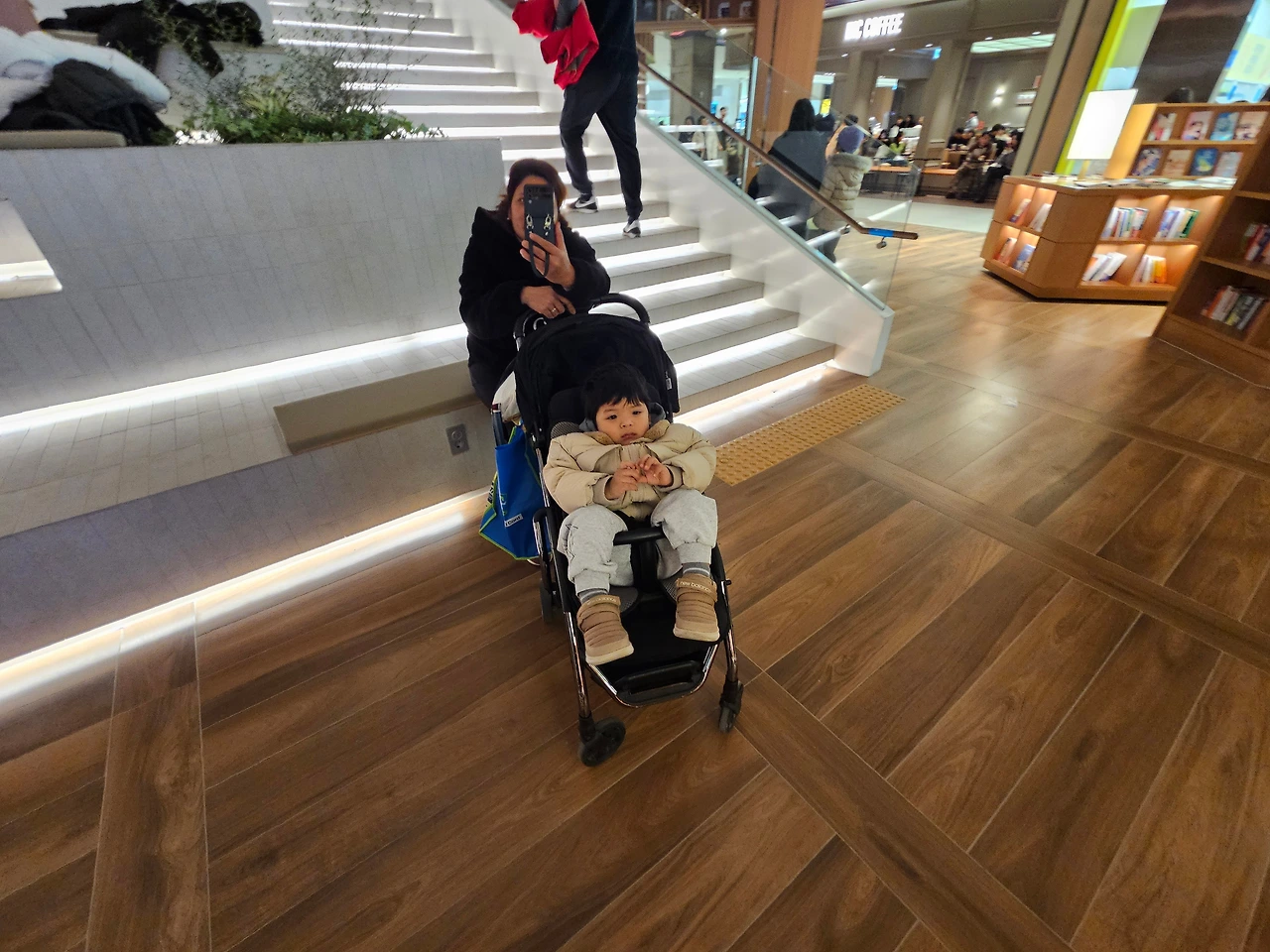 유모차에 탄 아들 요한이는 케이크 먹으러 카페 가자고 허리를 뒤집기 시작했다. 4층 INC COFFEE에는 요한이 먹일 케이크가 없어 6층 스타벅스에 갔다. 좌석은 많지 않고 손님은 많아 앉을자리가 없었다. 자리 잡기 전 먼저 길게 줄을 서 주문을 해 놓고 자리를 잡으러 다녔다. 스타벅스에 자리는 없지만, 주변에 쇼핑객 쉴 수 있게 마련된 자리가 몇 있었다. 금방 자리를 뜰 것 같은 자리 앞에 서성거리다 노스페이스 롱패딩으로 자리를 잡아 놓고, 아내와 아들을 데려 오고, 주문한 음료를 가져왔다. 아들이 딸기 음료를 마시고 고구마 케이크를 먹은 후, 아내가 우리동네 스타필드를 배경으로 TikTok을 하고 자기 시간을 가지며 쉬도록, 요한이를 유모차에서 내려 같이 우리동네 스타필드 6층을 돌았다. 에너지가 넘치는 28개월 아들 요한이는 케이크와 딸기 주스를 마시고 걸으니 기분이 좋은가 보다.