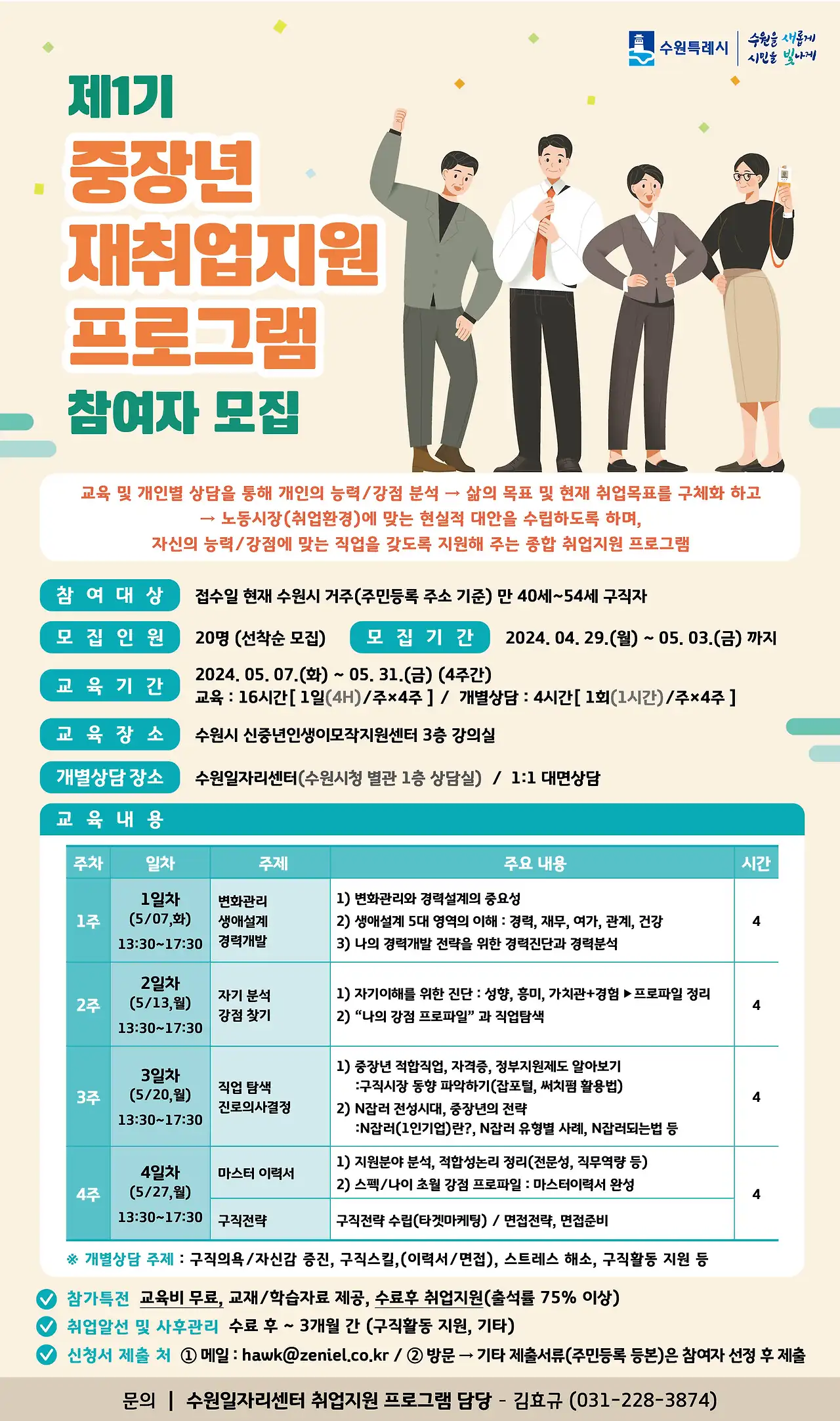 수원시 신중년이모작지원센터에서 중장년 재취업 프로그램 안내 문자가 왔다. 그래서 이번 달에는 그 교육을 듣고 있다. 인생 2막 3막을 준비하는 40대 50대 중장년을 대상으로 하는 재취업 프로그램이다.