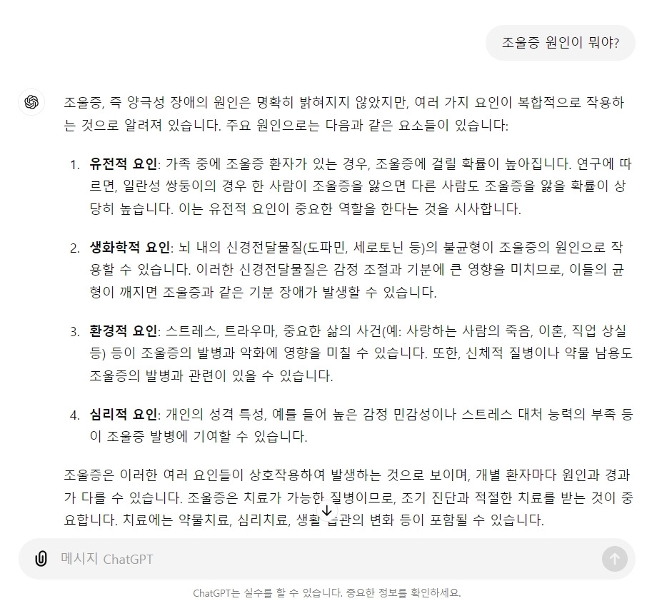 빙고! 딩동댕! 2000년 봄, 스무 살 군대에서 처음 발병하고 조울증과 24년을 함께 한 내가 몰라서 묻는 것은 아니다. 조울증의 원인에 대하여 ChatGPT는 어떤 답변을 내놓는지 호기심에 던져보는 질문이다. ChatGPT는 질문할 때마다 대동소이한 다른 답들을 하기도 한다. 내가 원하는 답을 얻어 스크린 캡처로 박제시켜 놓기 위해서는, 정답이 나올 때까지 인내심을 가지고 집요하게 질문을 던져야 한다.