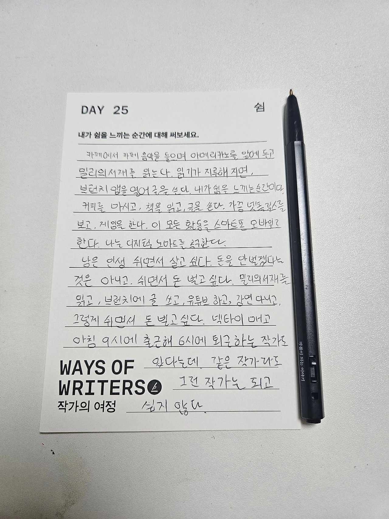 남은 인생 쉬면서 살고 싶다. 돈을 안 벌겠다는 것은 아니고. 쉬면서 돈 벌고 싶다. 밀리의서재를 읽고, 브런치에 글 쓰고, 유튜브 하고, 강연 다니고, 그렇게 쉬면서 돈 벌고 싶다. 넥타이 매고 아침 9시에 작업실로 출근해 6시 퇴근하는 작가도 있다는데. 같은 작가라도 그런 작가가 되고 싶지는 않다.