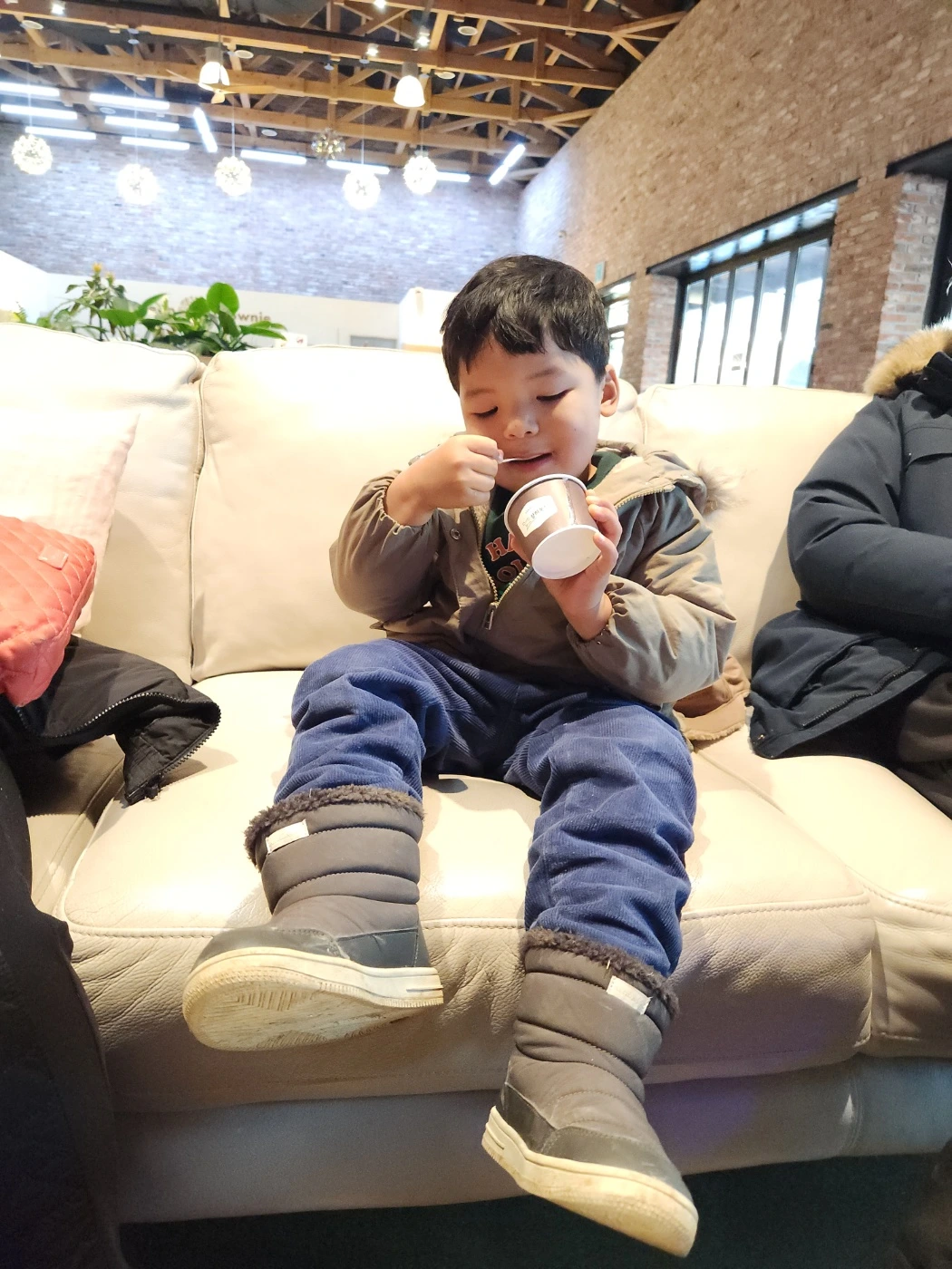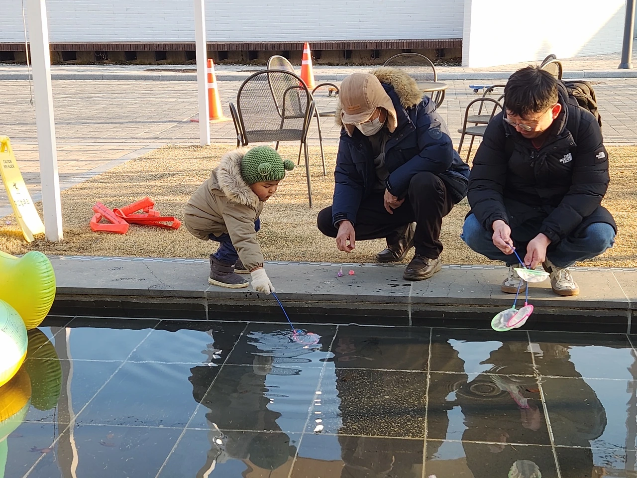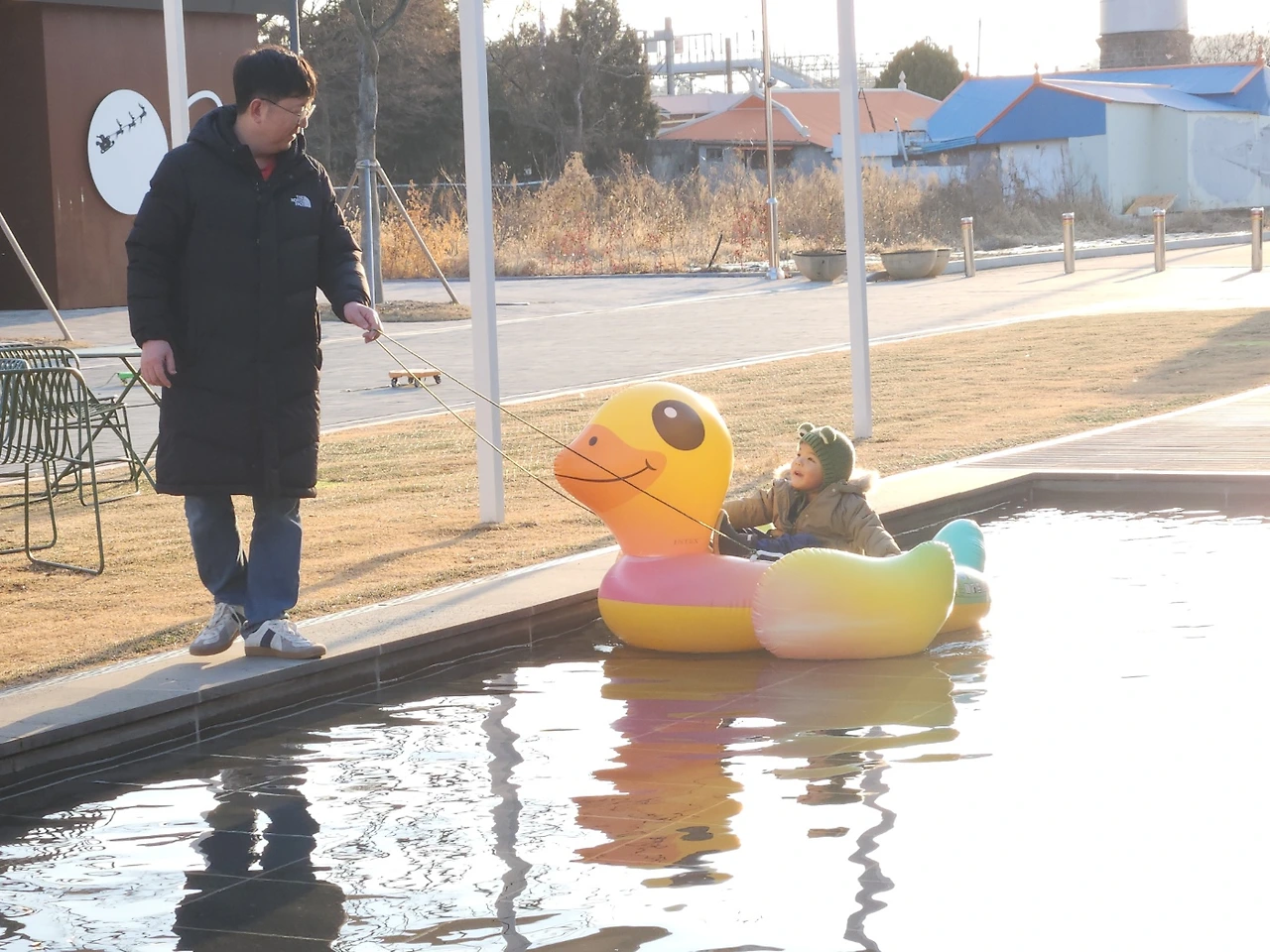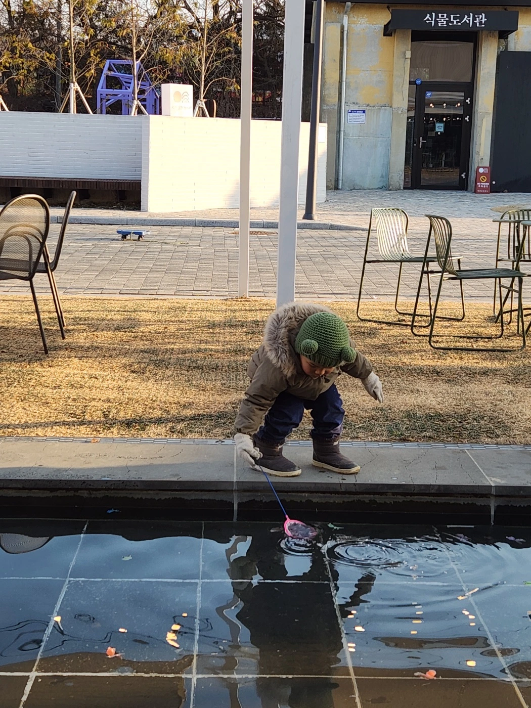 연산역 근처 연산문화창고에 카페 그린브라우니가 있다. 카페 마당에 놀거리가 있다. 여름에는 여기 와서 물놀이를 했는데, 겨울이라 플라스틱 물고기를 잡고 튜브 보트를 태웠다. 수심이 발목 정도 된다.