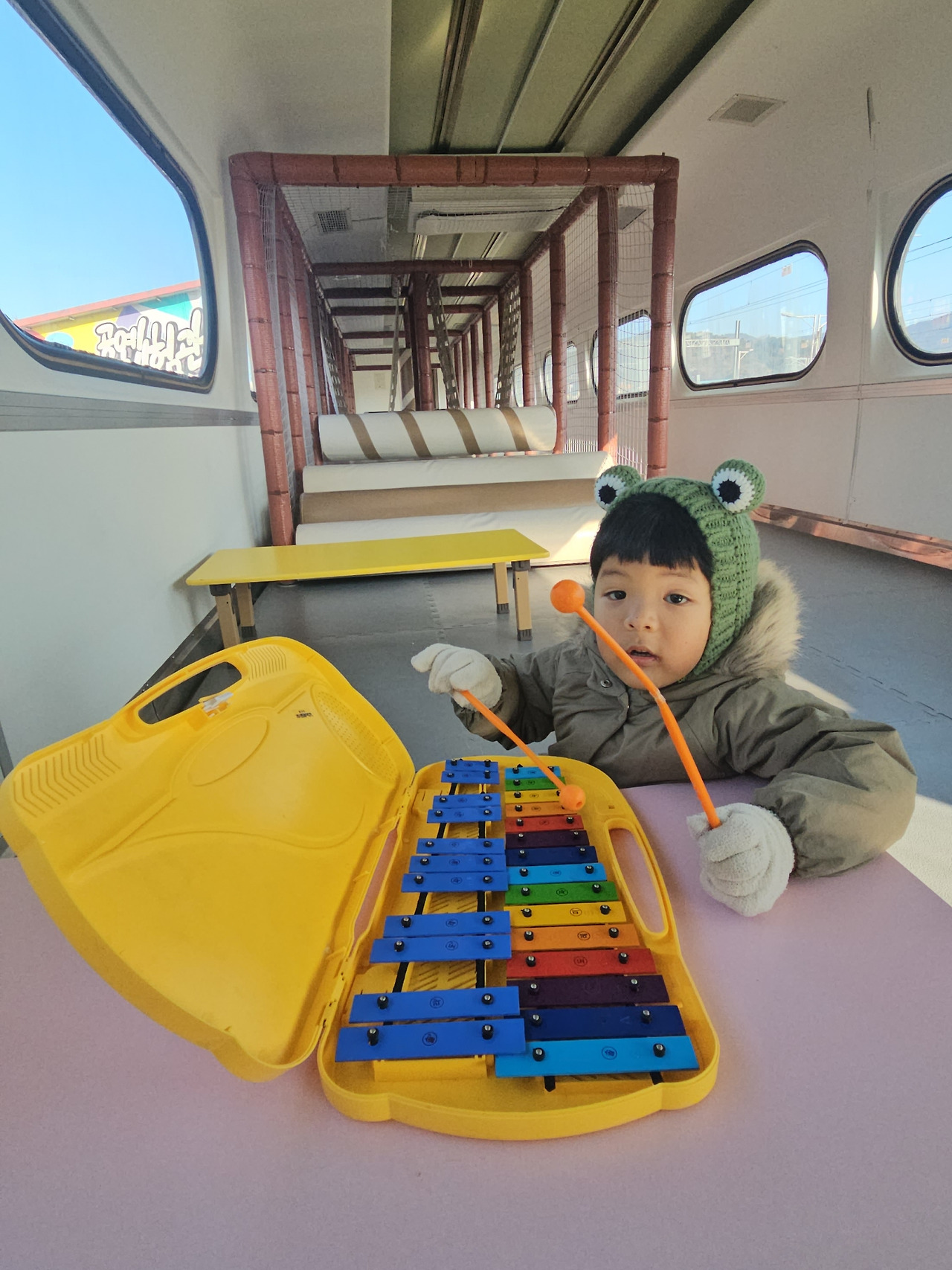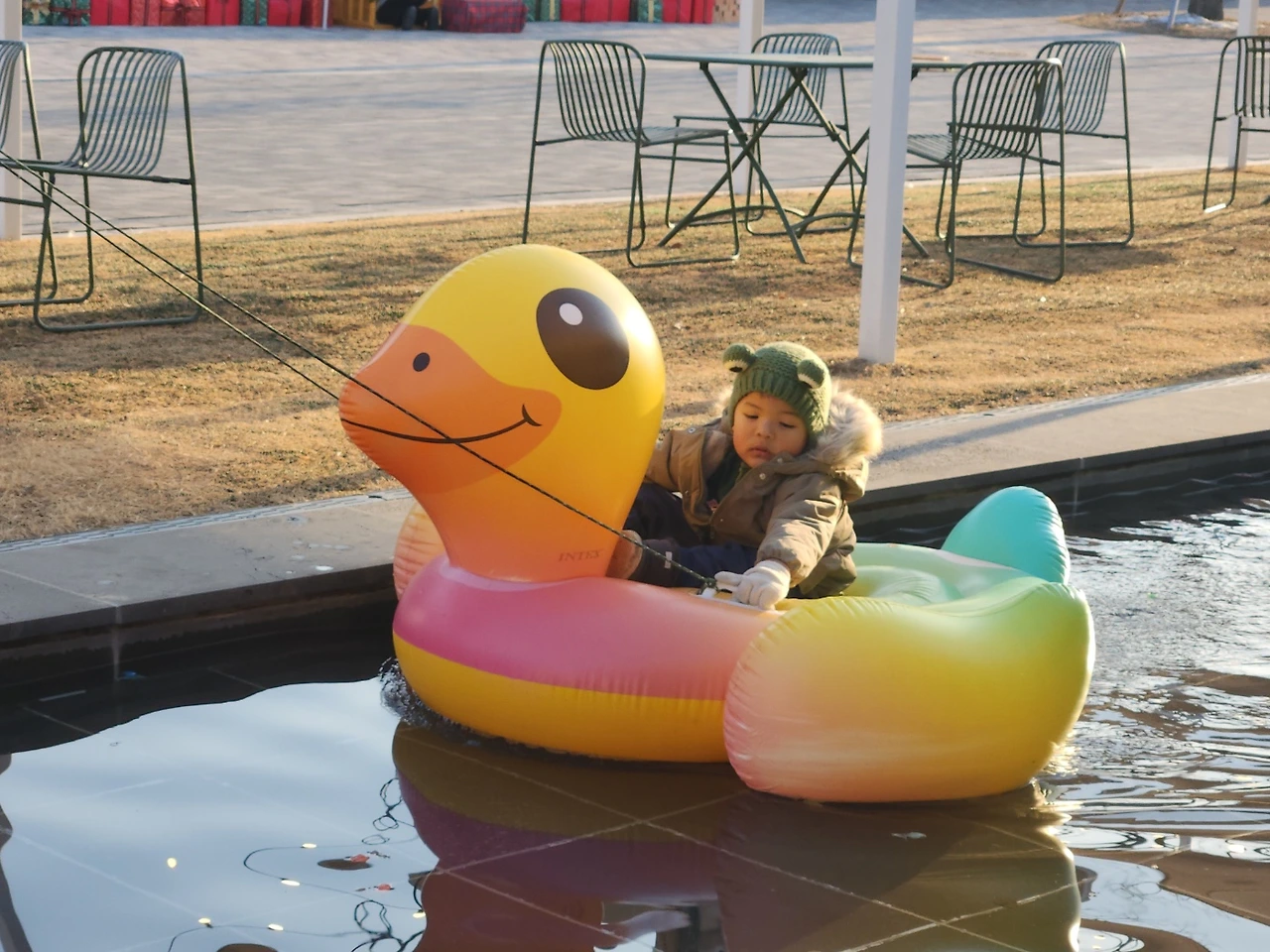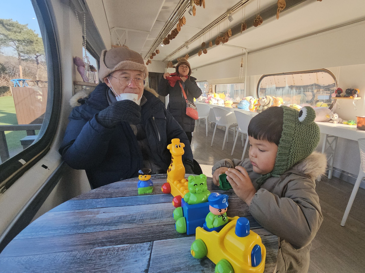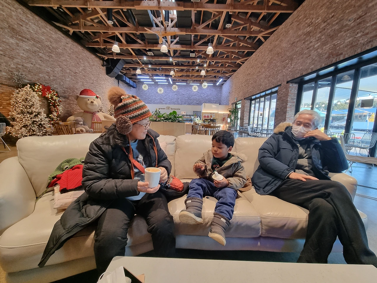 연산역 근처 연산문화창고에 카페 그린브라우니가 있다. 카페 마당에 놀거리가 있다. 여름에는 여기 와서 물놀이를 했는데, 겨울이라 플라스틱 물고기를 잡고 튜브 보트를 태웠다. 수심이 발목 정도 된다.