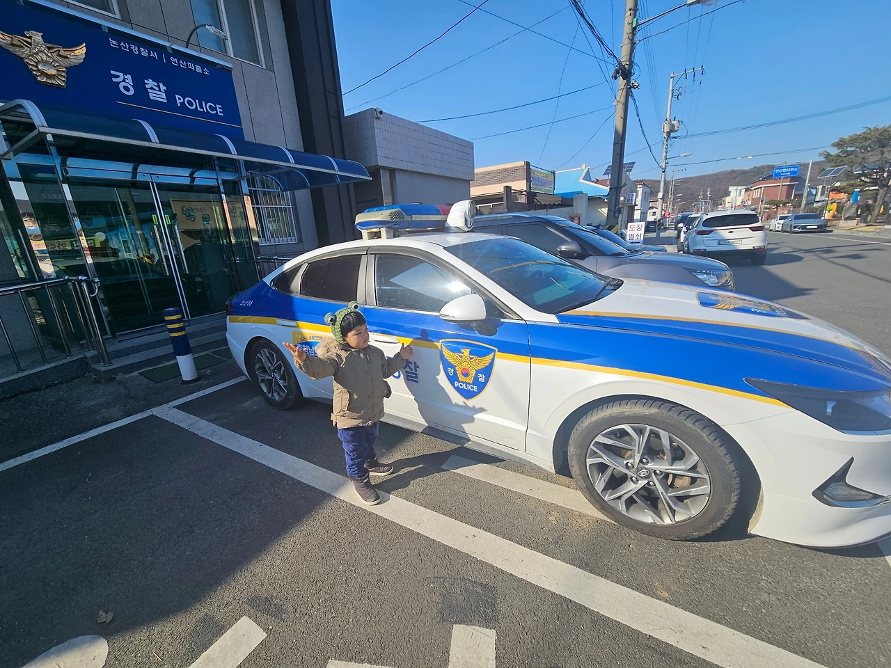 요한이가 좋아하는 경찰차 옆에서 포즈를 취했다.