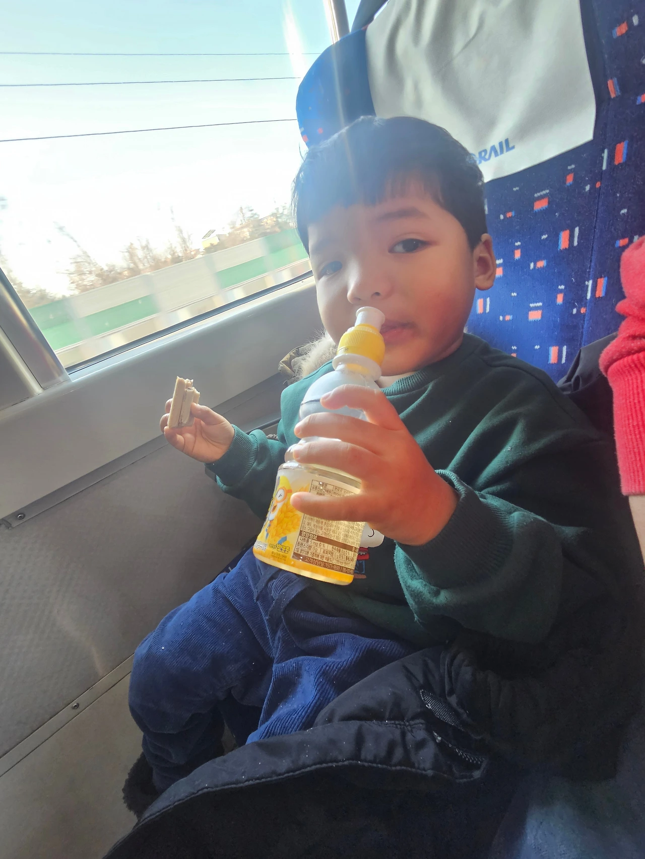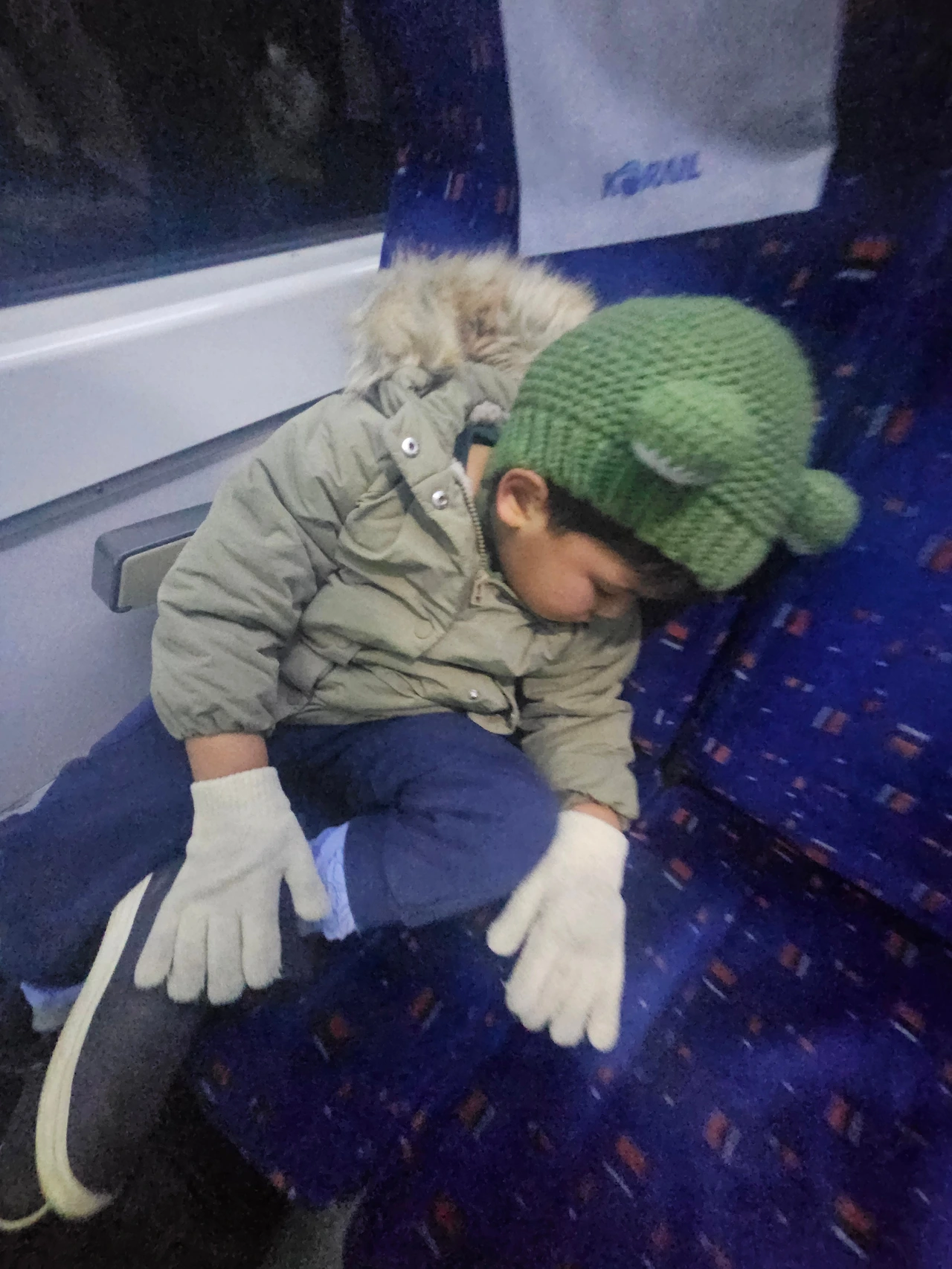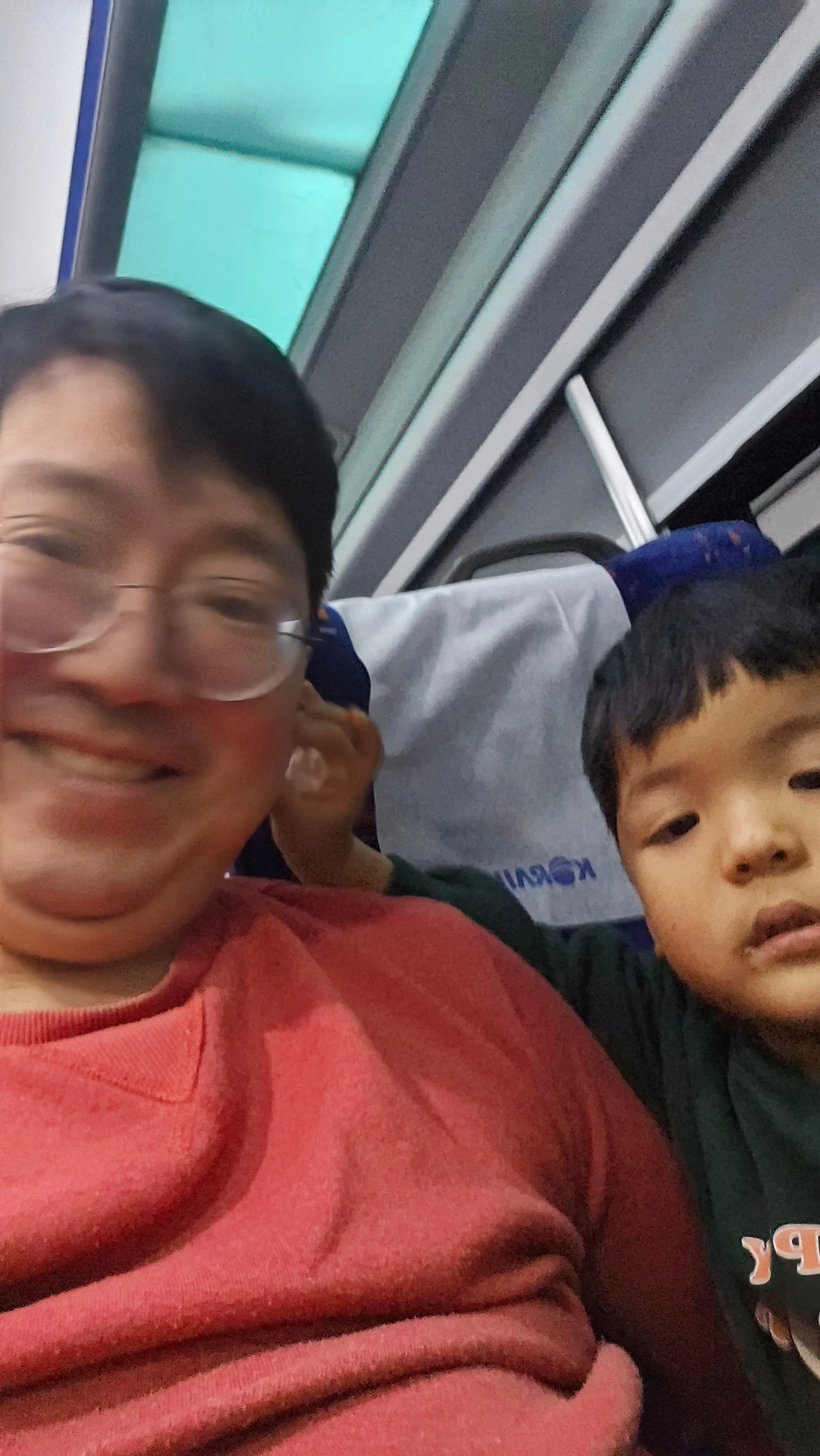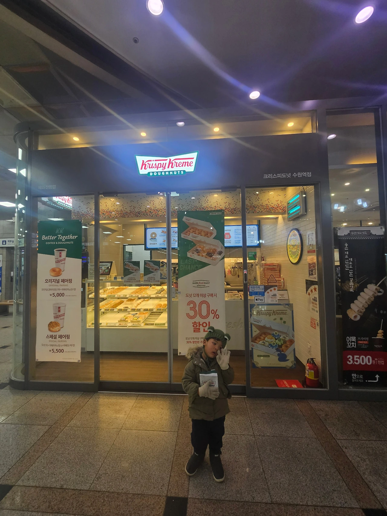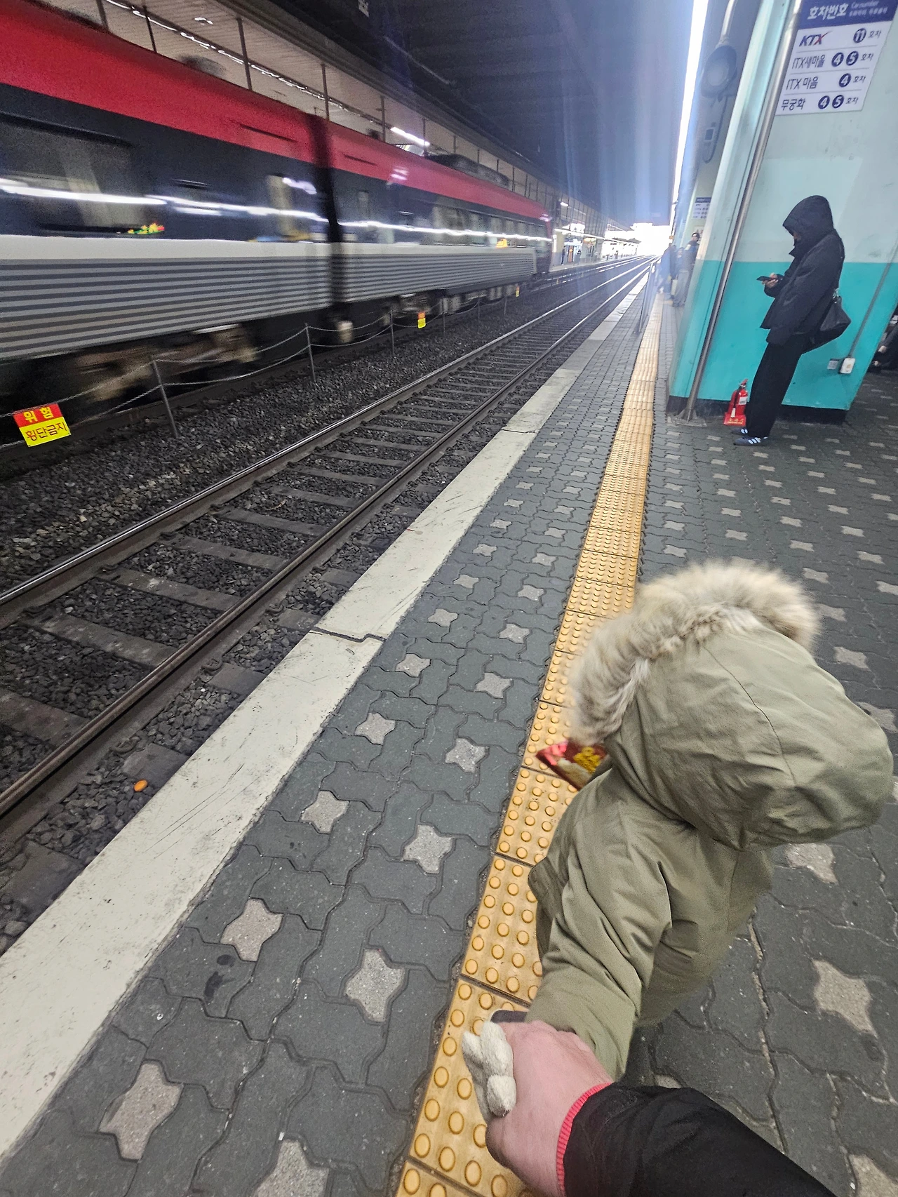 연산역에서 할아버지 할머니랑 바이바이 하고 기차를 탔다. 내내 쌩쌩하더니 도착 7분 남기고 잠에 들었다. 안고 역사로 올라왔는데 무거워 내려놓았는데 바로 깨더니 도넛 집에 들어가 도넛을 골랐다.