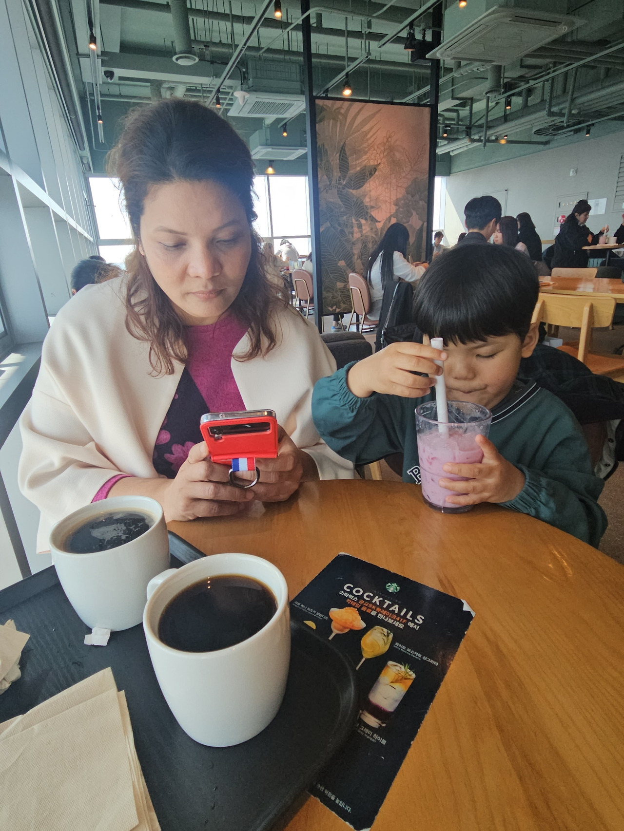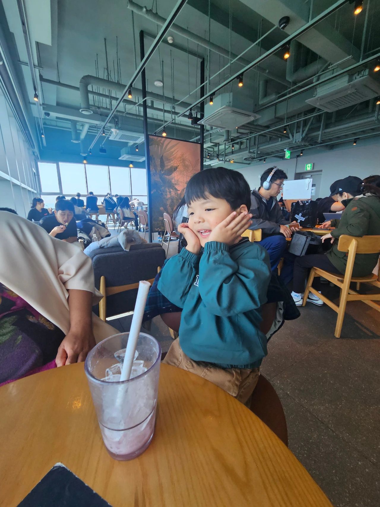 거기도 사람이 많았지만. 주말 스타필드 스타벅스만큼은 아니었고. 전망이 좋아 자리 날 때까지 기다리는 게 스트레스가 되지도 않았다. 나와 아내는 아메리카노를 마시고, 요한이는 딸기 라떼를 마셨다.