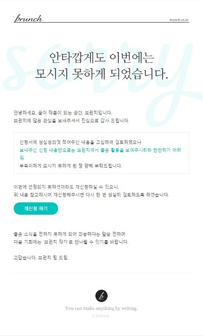나는 브런치 작가에 12번 떨어지고 13번째 붙었다. 2019년 12월 03일 첫 거절 이메일을 받았고, 2020년 10월 5일 합격 이메일을 받았다. 브런치로부터 온 이메일의 제목이『브런치 작가 신청 결과 안내드립니다.』이면 나쁜 소식이고, 『브런치 작가가 되신 것을 환영합니다.』이면 좋은 소식이다.