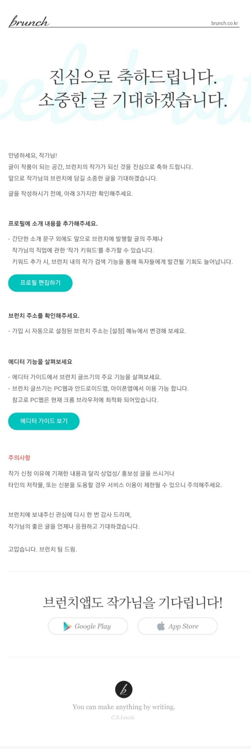 브런치 작가에서 떨어졌을 때는 왼쪽의 메일이 오고, 합격했을 때는 오른쪽의 메일이 온다. 모르긴 몰라도 브런치 직원이 일일이 보내지는 않을 테고, 심사 결과가 나오면 합격자와 불합격자에게 해당되는 메일이 자동 발송될 것이다.