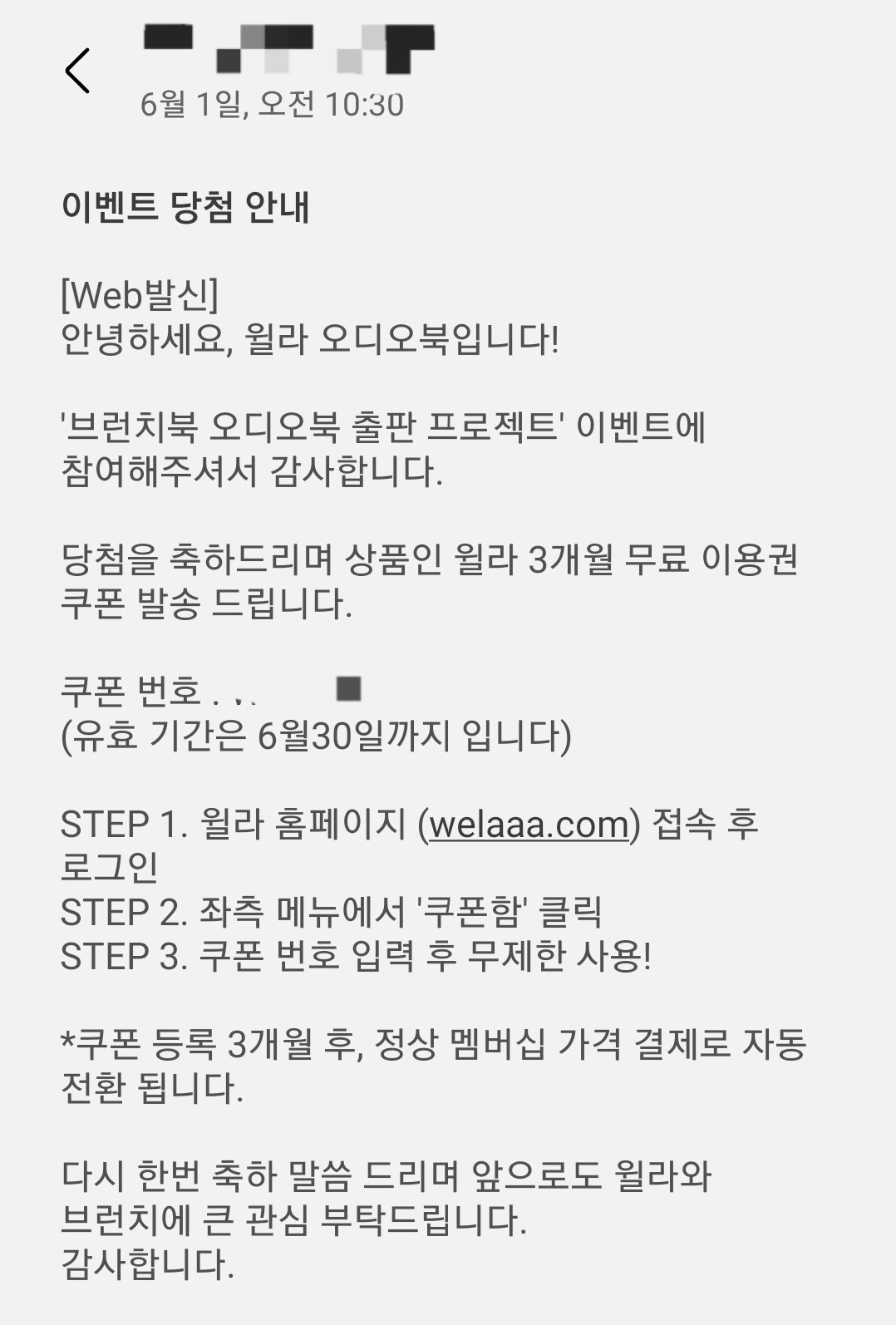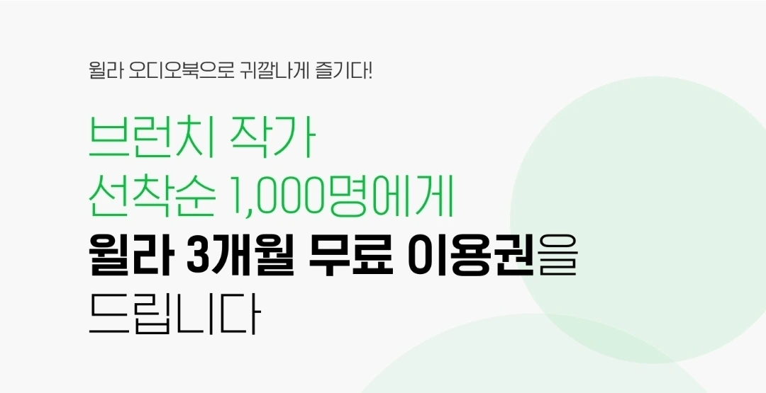출근길이다. 전철 안에서 네이버 VIBE 음악 대신 윌라 오디오북을 들으며, 스마트폰으로 글을 쓰고 있다. '브런치북 오디오북 출판 프로젝트'의 6월 공고를 앞둔 이벤트에 당첨되어, 월라 3개월 무료 이용권에 당첨되었다. 운이 좋았다기보다, 순발력이 빨랐다. 선착순으로 1000명의 신청자에게 윌라 오디오북 3개월 무료 이용권을 준다는 브런치 알림을 확인하자 바로 신청했다.