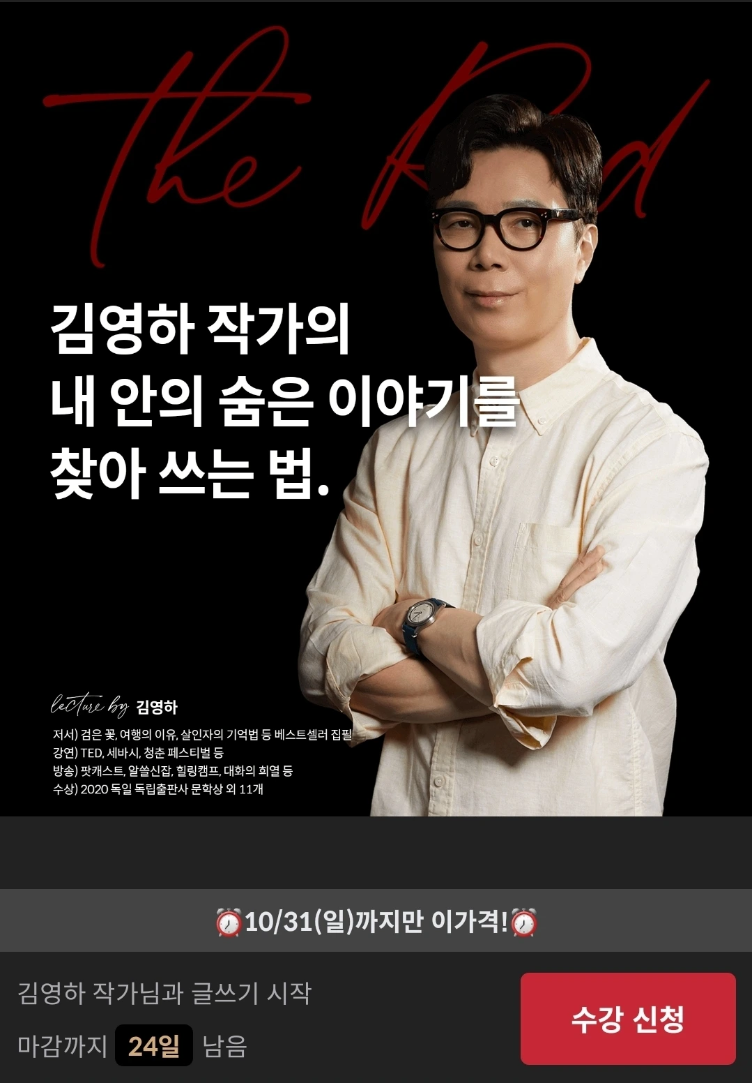 회사에서 일을 하다가 온라인 강의 사이트인 패스트캠퍼스의 광고를 보았어. 김영하 작가의 글쓰기 강의였어. 289,000원이 정가인 강의를 이번 달까지만 179,000원의 가격으로 영구적으로 들을 수 있다는 광고였어. 김영하 작가가 에세이도 쓰지만 소설가이고, 아빠는 에세이 작가를 꿈꾸지만, 소설이나 에세이나 같은 이야기고, 현재 대한민국의 최고 이야기꾼이자 작가 김영하의 강의를 듣고 싶었어.