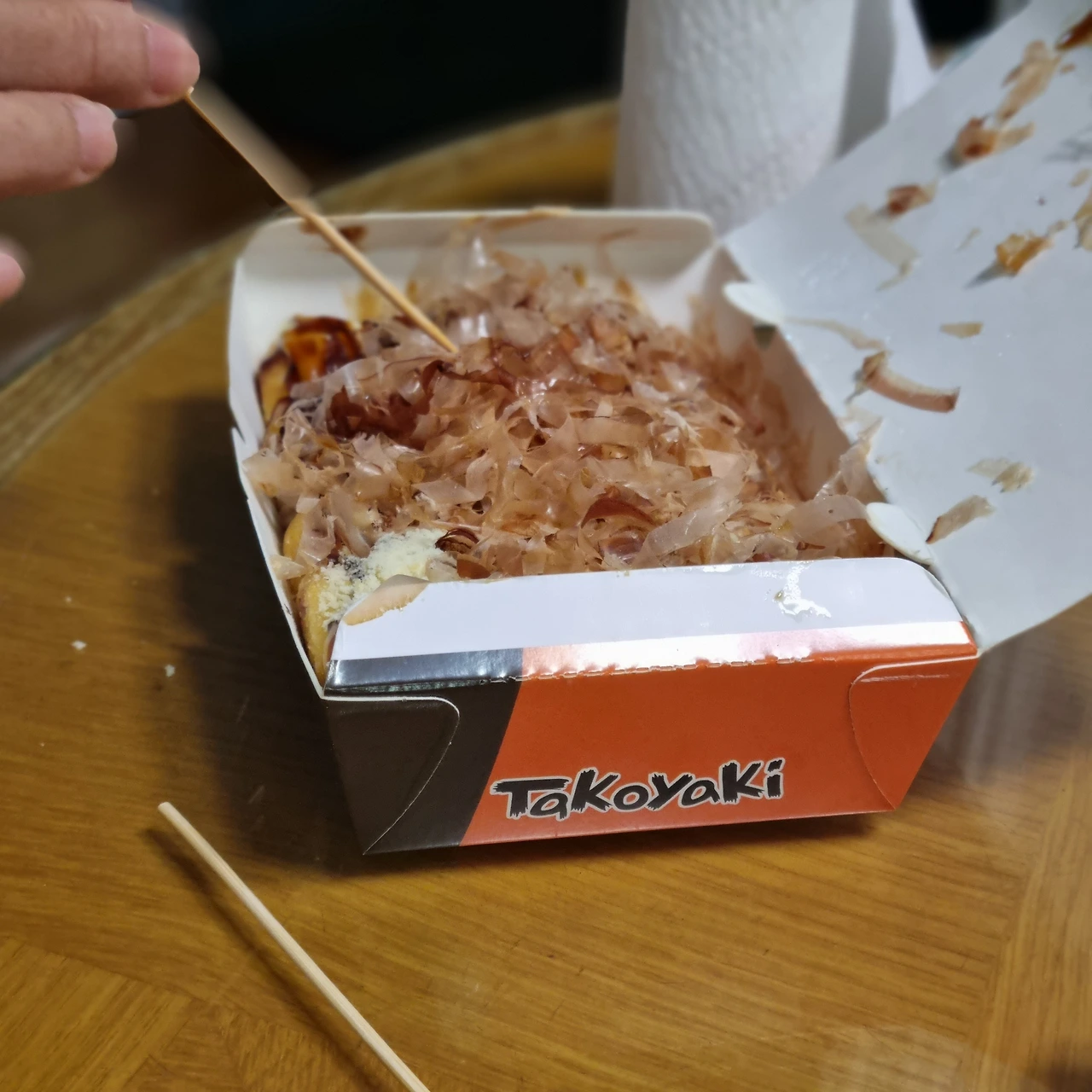 어쨌거나 저쨌거나, 타코야키 파는 데가 차장사임에도 불구하고 카드를 받아서, 아내 카드로 타코야끼를 살 수 있었다. 오리지널 소스와 치즈맛 소스를 반반해서 중자로 시켰다. 본체는 똑같고 위에 뿌리는 소스를 선택할 수 있다. 매운맛까지 세 가지 맛의 소스가 있는데, 아내도 매운맛을 좋아하고 잘 먹는데, 수유하기 때문에 매운맛 소스를 빼고 나머지 소스를 반반 섞었다.