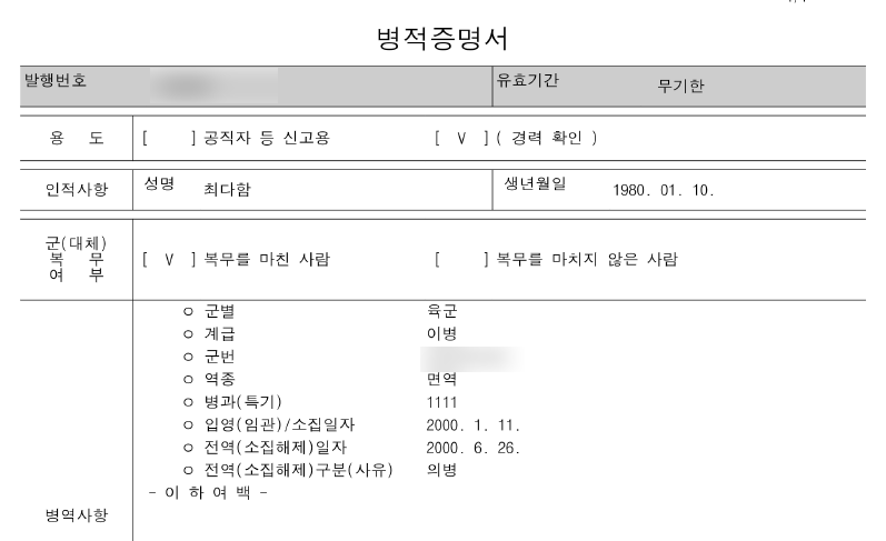 나는 2000년 1월 11일 군대에 입대했다. 1월 10일이 생일이고, 그다음 날이 입대일이었으니, 입대일은 정확하게 기억한다. 정확한 날짜는 기억하지 못하지만, 그해 봄 군대에서 조울증에 걸렸고, 그해 6월 제대했던 것으로 기억에 남아있다. 내 클라우드에 이력서가 남아있으면, 이력서에 군 제대일이 적혀있지 않을까 해서 검색해 보았는데, 찾은 단 하나의 이력서 파일에는 그런 기록은 적혀 있지 않았다. 온라인으로 기록을 찾을 수 있을까 해서 네이버 검색을 해보았다.