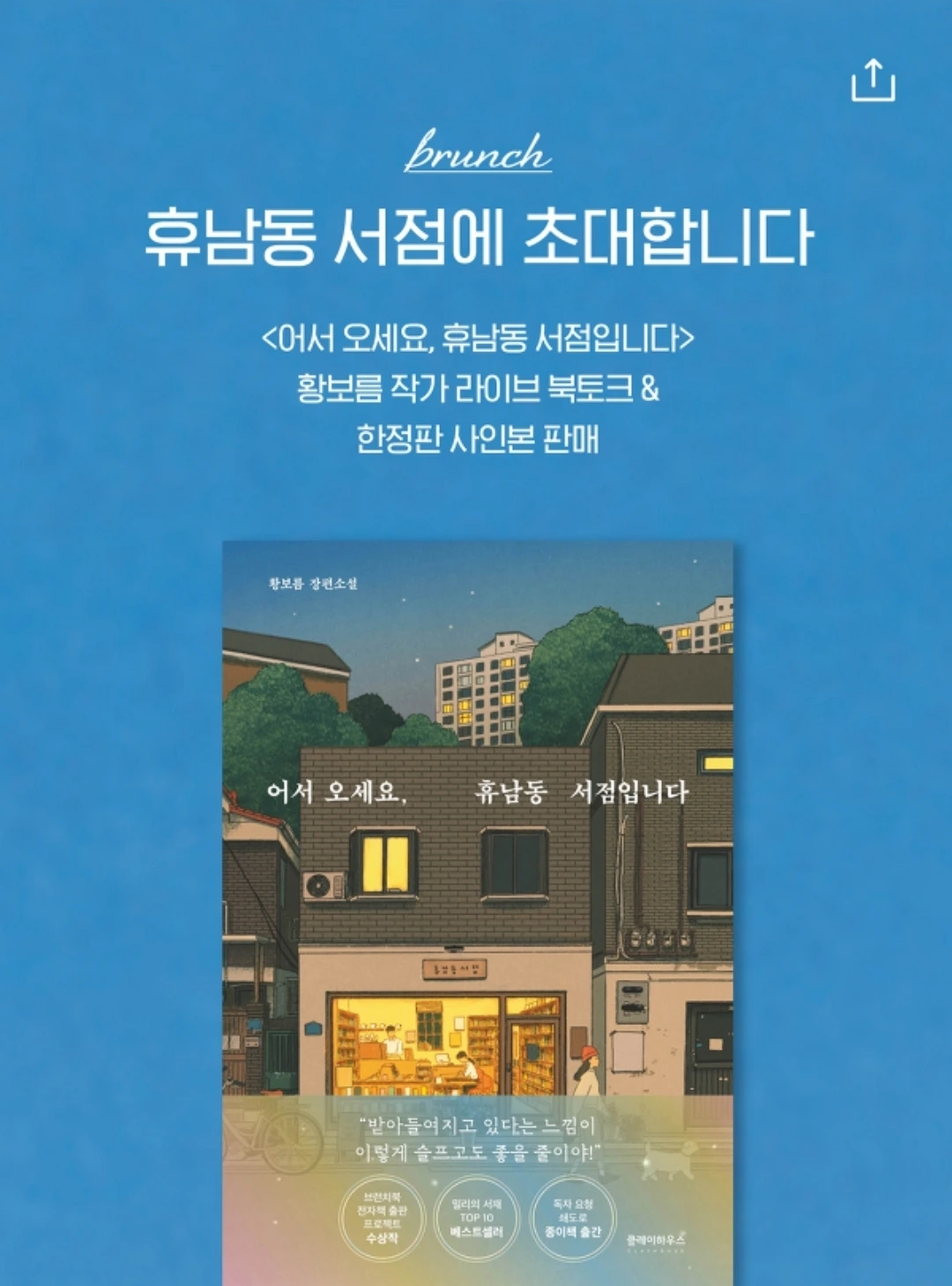 퇴근길 지하철에서 <어서오세요, 휴남동 서점입니다> 황보름 작가님의 라이브 북토크를 들었다. 사전에 광고를 보고 북토크 알림 신청을 해놓았는지라 알림이 왔다. 브런치에서도 오늘 북토크 안내를 알림으로 보내주었던 것 같은데, 나는 카카오톡 광고에서 보았던 것으로 기억한다.