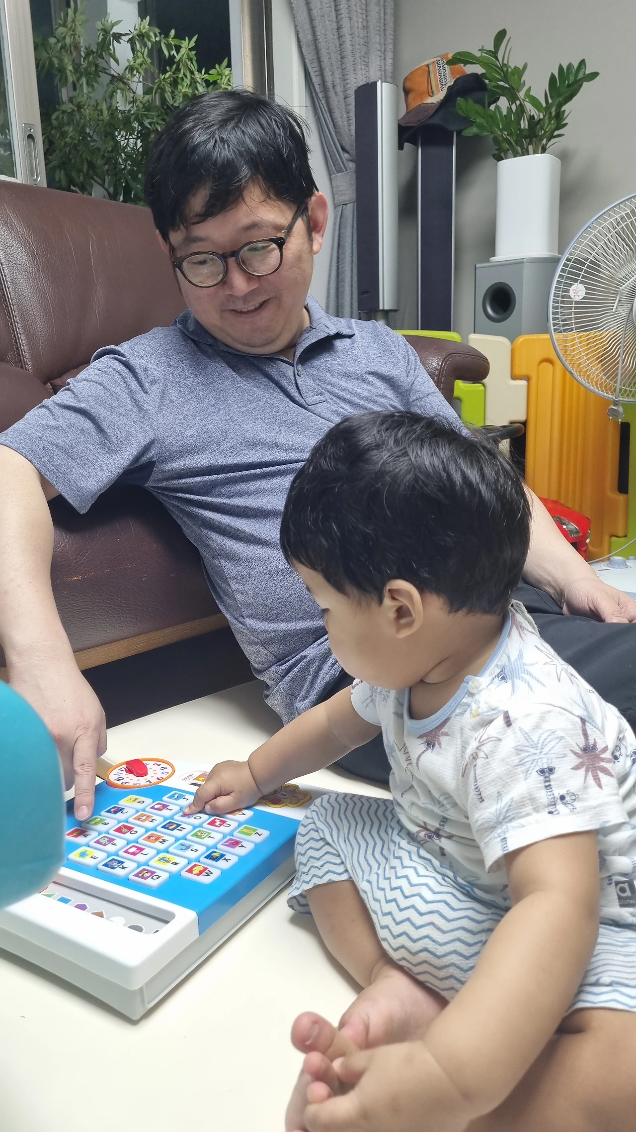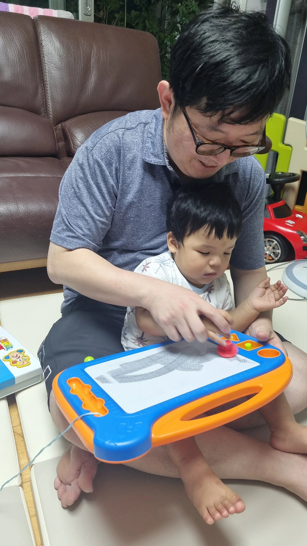 아직 놀이의 의미는 모르지만, 엄마 아빠가 고르고 사준 장난감을 가지고 아빠랑 노는 게 재미있나 보다.