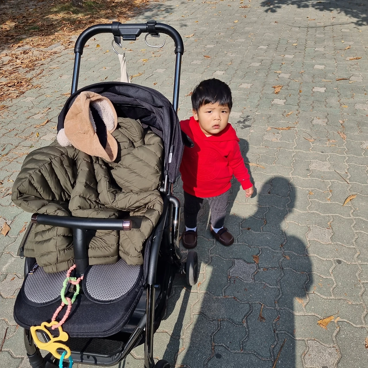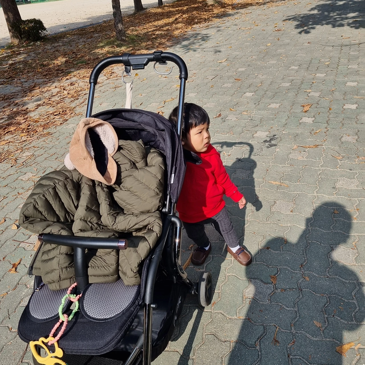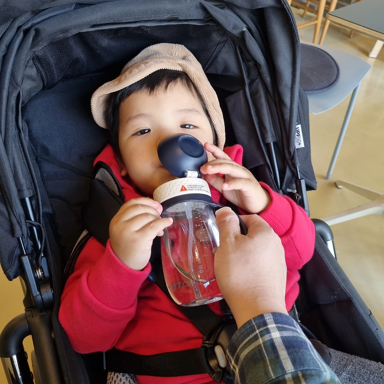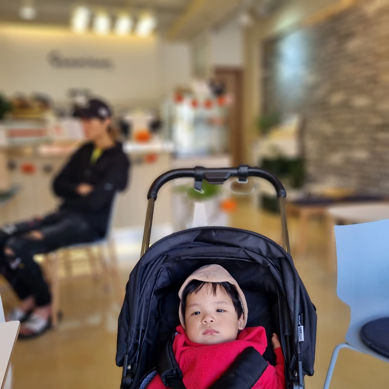 유모차에 태우고 나가, 잠시 걷게 하고, 카페에 가서 커피 한 잔 마시고 왔다.