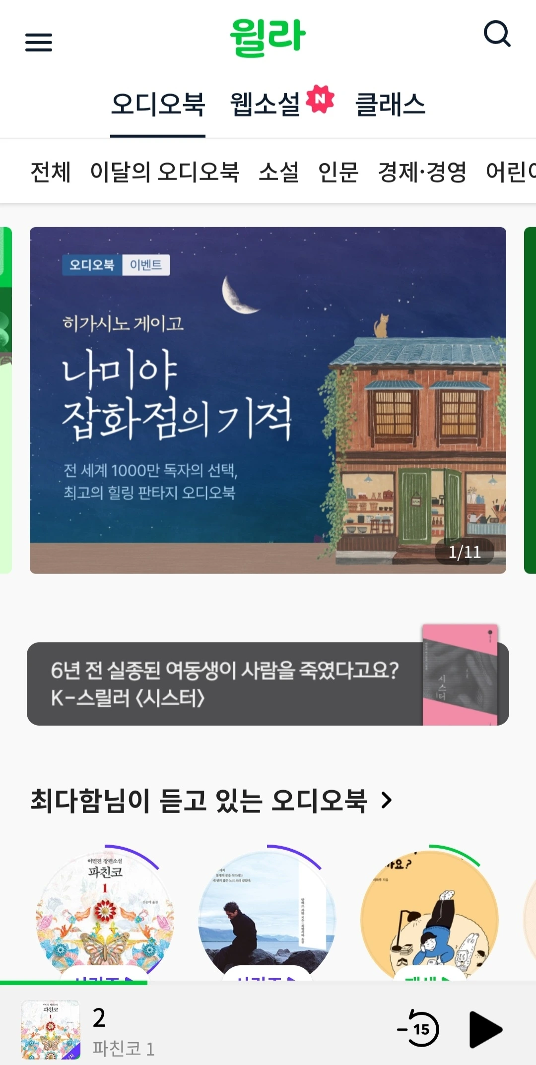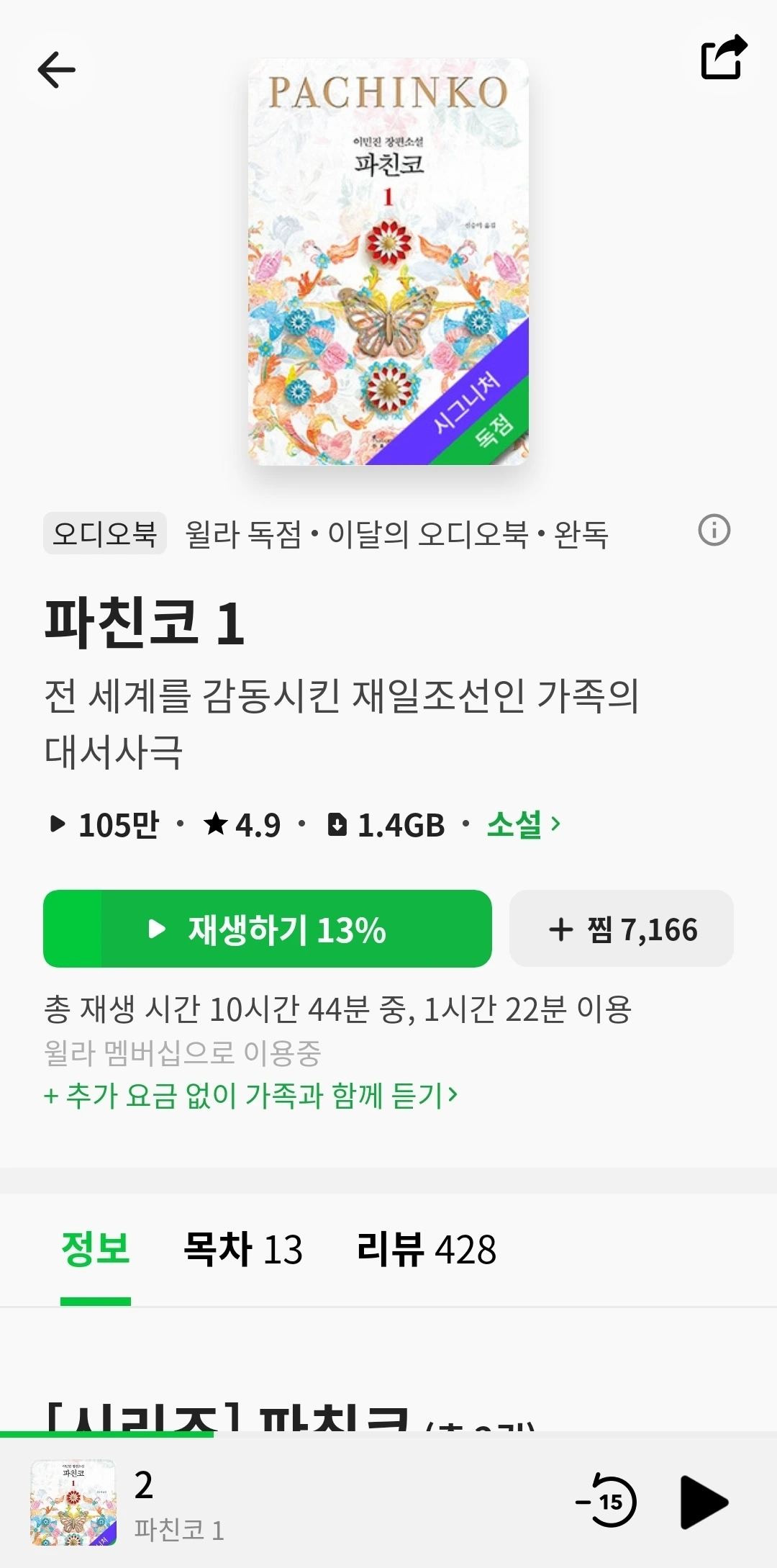윌라를 구독하고 처음 들은 오디오북은 이민진 작가의 『︎파친코』였다. 윌라를 다시 구독하게 된 결정적인 계기가 이 책을 듣기 위해서였다. 이 소설을 원작으로 한 드라마 『︎파친코』︎를 보고 싶었는데, 애플을 쓰지 않는 내가 이 드라마 한 편 보려고 애플tv를 구독할 수는 없었다. 그런 와중에 이민진 작가의 『︎파친코』︎를 들을 수 있다는 윌라 광고의 홍수 속에 노출이 되었고, 서점 가고 책을 사는 대신 윌라를 구독하기로 했다.