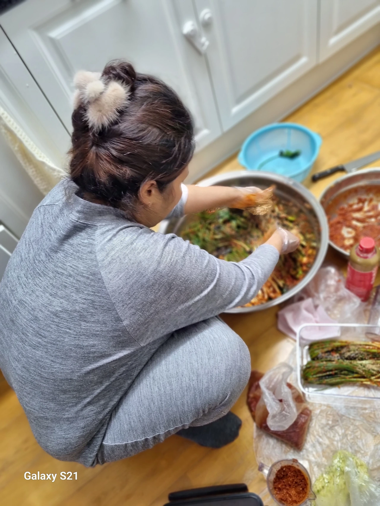 아내가 갓김치를 담그는 동안 내가 요한이를 재운 후, 아내 에미마가 갓김치 담그는 동영상을 찍으려고 다가갔다. "에미마, 갓김치 만드는 동영상 찍을 거야."