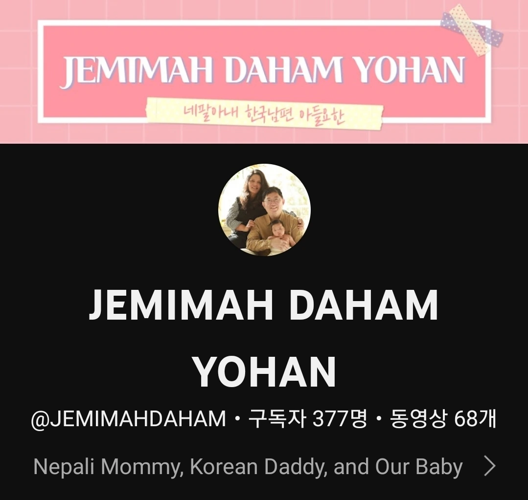 나는 유튜브도 한다. 《JEMIMAH DAHAM YOHAN》이라는 이름의 가족 콘텐츠 채널이다. 처음 기획은 내 개인 유튜브였다. 에미마는 서브 출연자였고 내가 메인이었는데. 처음 기획은 그랬다. 유튜브 하겠다는데 지지부진하게 보였는지 아내가 네팔의 가족 친구에게 전화를 돌려 구독자 300명 대 채널을 만들었다. 오늘 현재 구독자는 377명이다.