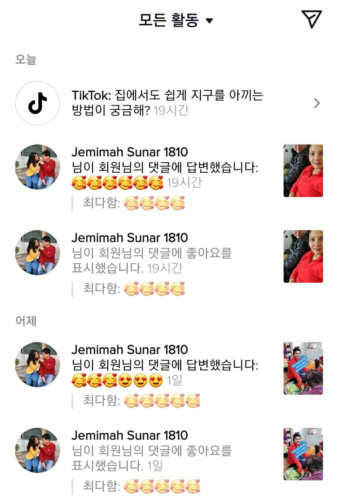 내 이름으로 본인의 틱톡에 댓글을 남기고, 그 댓글의 댓글을 다는 귀여운 나의 아내 에미마