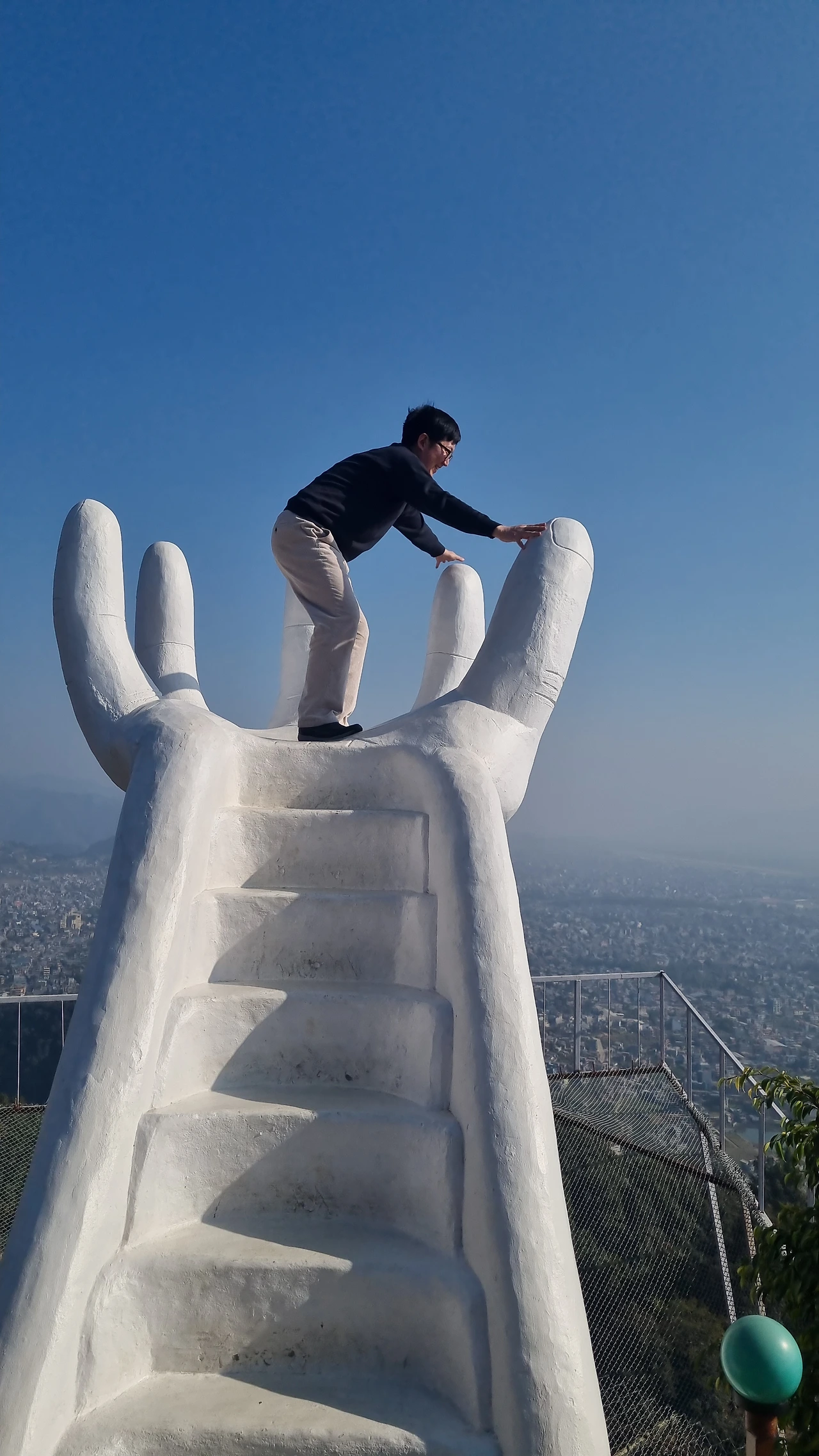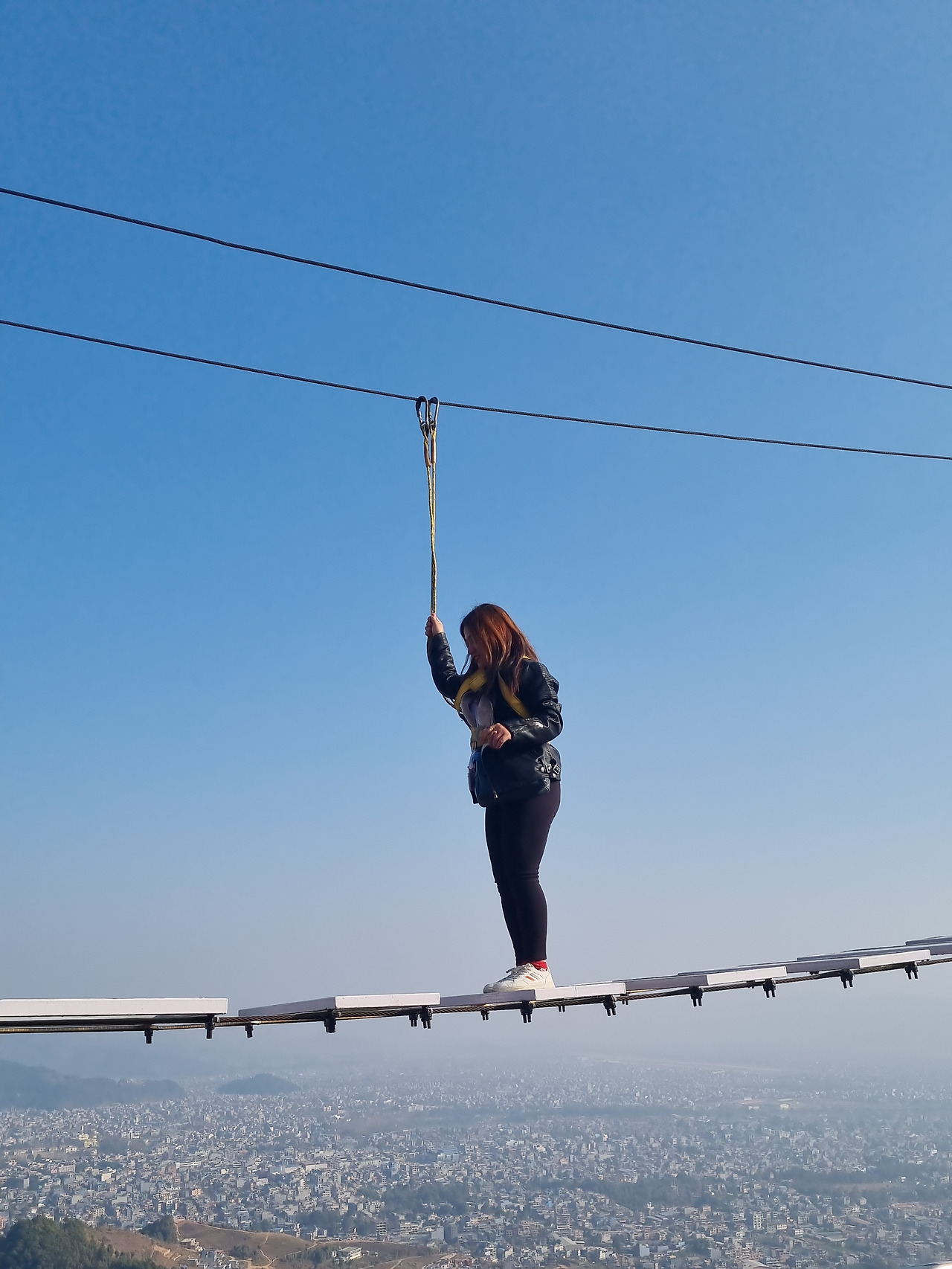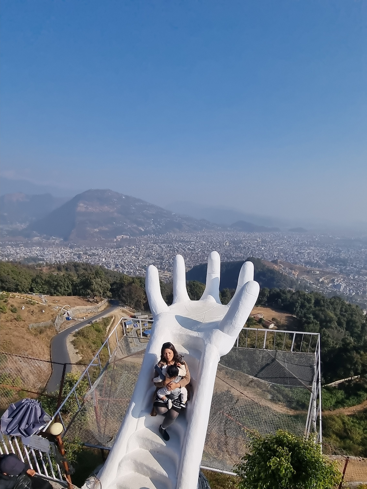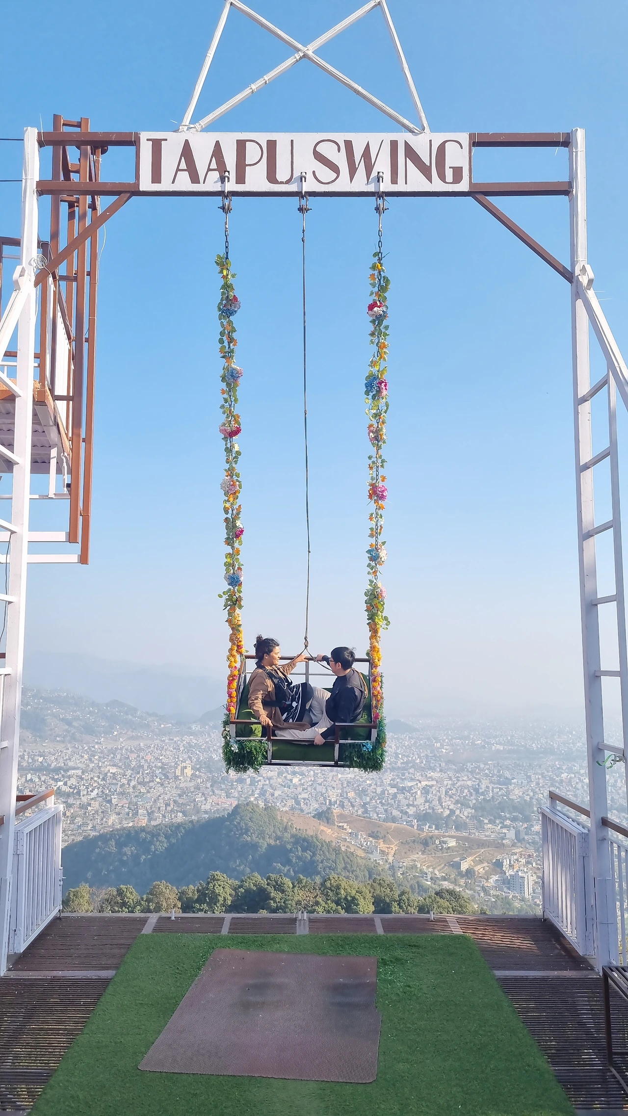 택시를 두 대를 나누어 타고 포카라 도심과 저 멀리 큰 산이 보이는 결코 잡지는 않지만 상대적으로 작은 산에 올라가 사진을 찍었다. Taapu Restro & Cottage라는 카페인데, 위험해 보이지만 위험하지 않은 액티비티 몇 개를 할 수 있는 카페였다.
