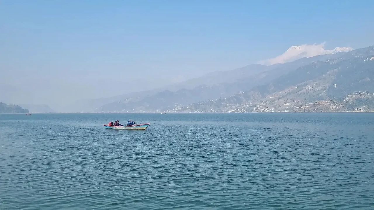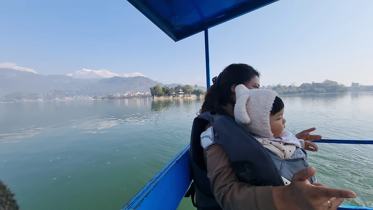 포카라에 산만 있는 것은 아니다. 히말라야에서 흘러내려 모인 물이 강이 있으니 페와 호수이다. 페와 호수에서 발로 저어 가는 무동력 보트를 탔다. 우리는 어린아이들과 함께 하여, 노 젓는 나룻배 대신 발로 저어 가는 낚시터의 작은 바지선 같은 보트를 탔다. 그냥 강에서 보트 타는 재미가 아니라, 뱃사공이 발로 저어 천천히 강물에 흘러가면, 히말라야 설산이 풍경으로 보이는 재미다.