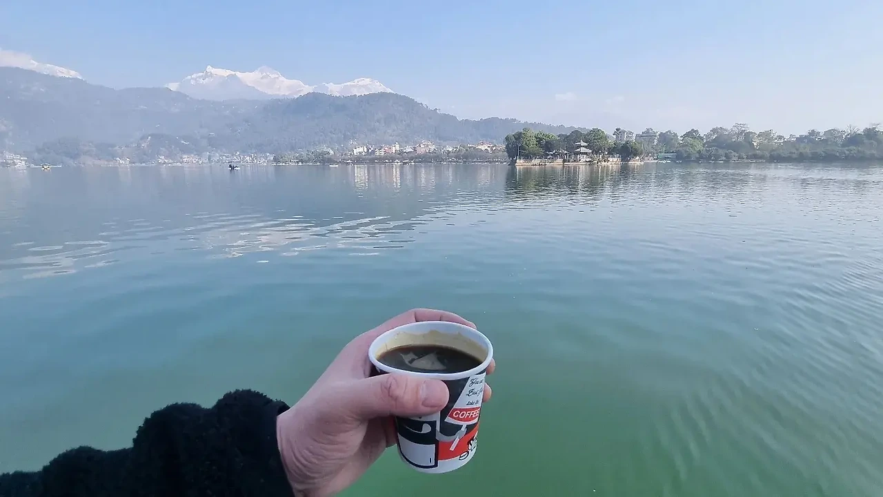 보트에 뱃사공의 것으로 보이는 배낭을 하나 있어 뭔가 했더니, 보온병에 뜨거운 물이 있어 보트를 타고 히말라야 산을 풍경으로 커피를 마실 수 있었다.