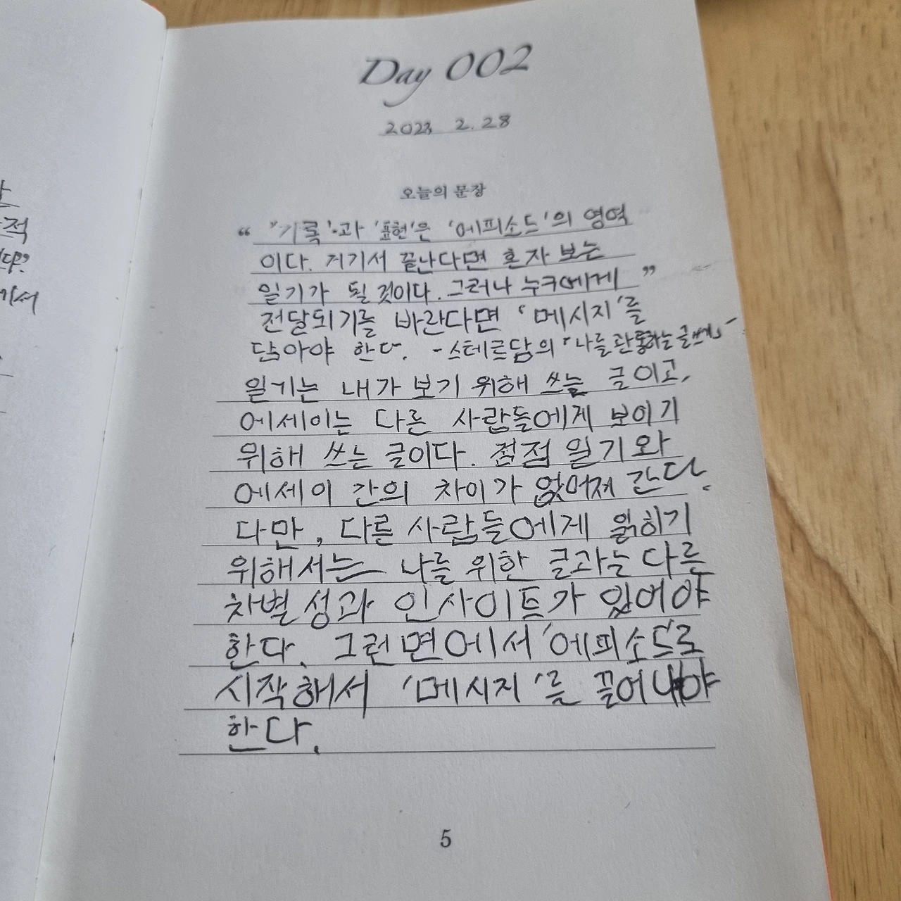 '기록'과 '표현'은 '에피소드'의 영역이다. 거기서 끝난다면 혼자 보는 일기가 될 것이다. 그러나 누구에게 전달되기를 바란다면 '메시지'를 담아야 한다.- 스테르담의 《나를 관통하는 글쓰기》 중에서 -