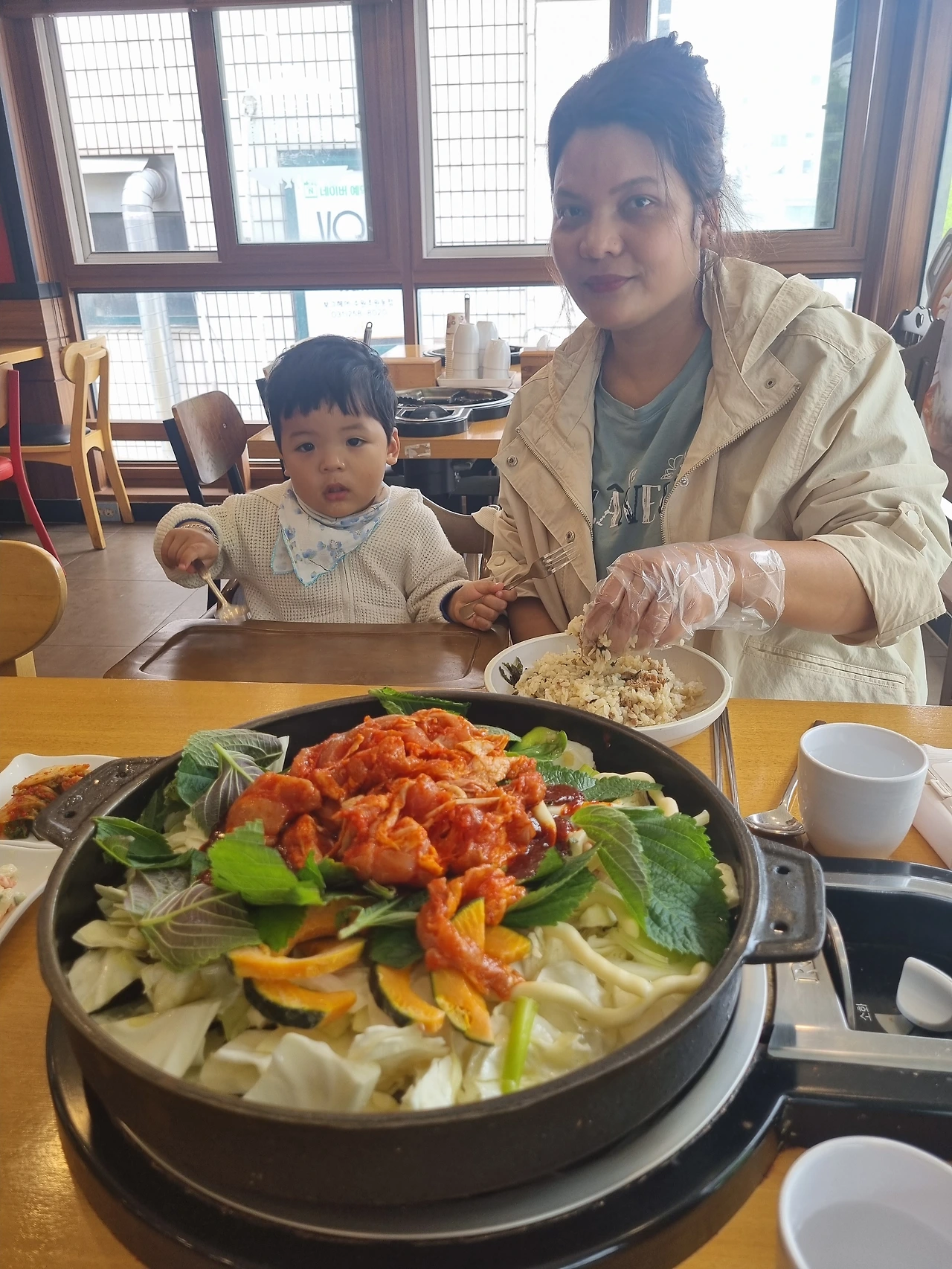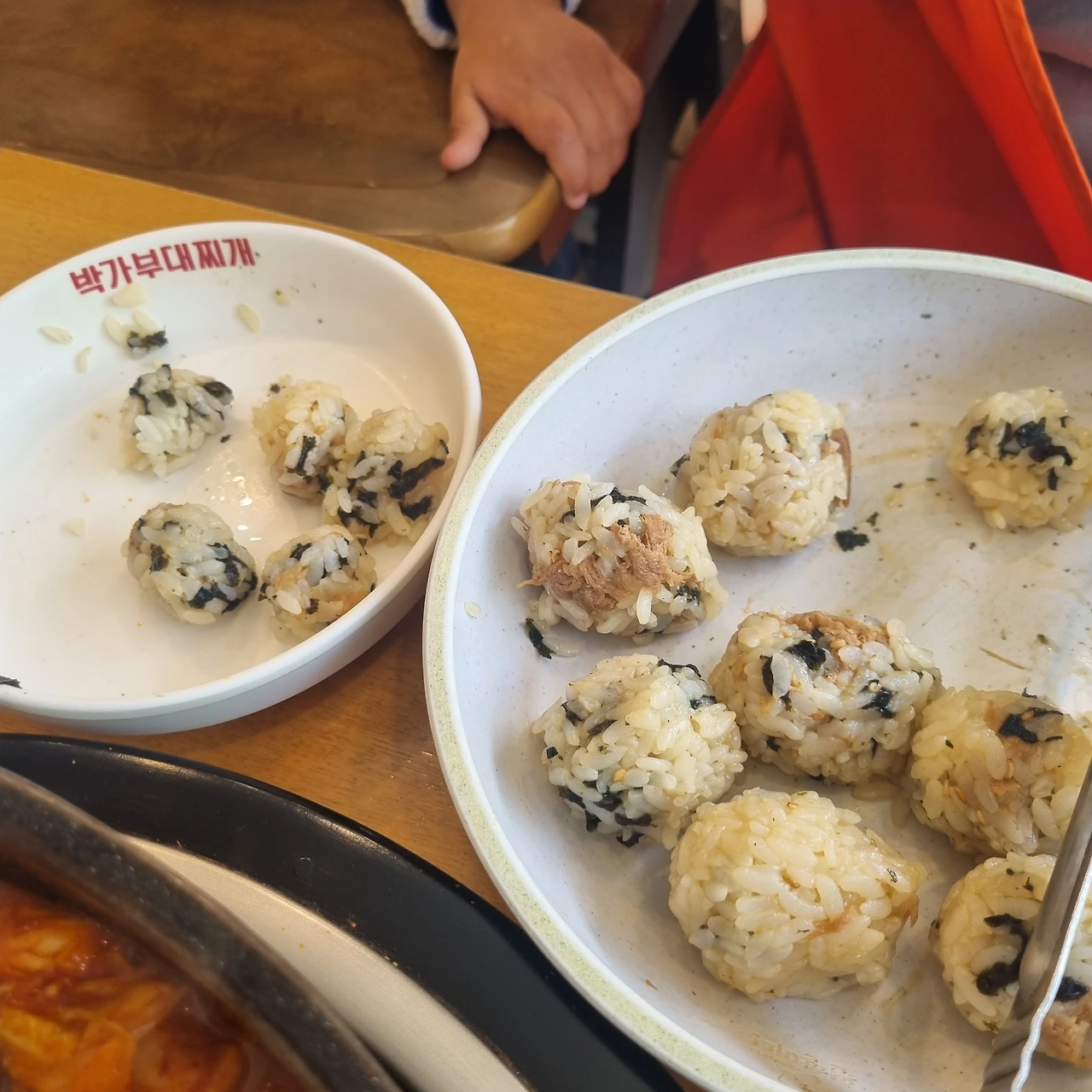 박가부대 테이블에 앉아서, 박가부대 닭갈비 2인분을 시키고, 아들 요한이를 위해 원할머니 장조림 주먹밥을 시켰다.