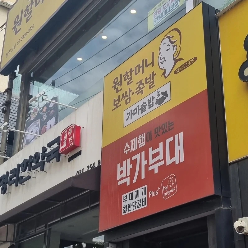 박가부대에 갔다. 원할머니 보쌈 족발 브랜드에서 하는 주가 부대찌개이고 부가 닭갈비인 브랜드다. 우리가 간 매장은 한 집에서 원할머니 박가부대 둘 다 했다. 같은 집이라 박가부대에서 원할머니를 같이 시켜 먹을 수 있다.