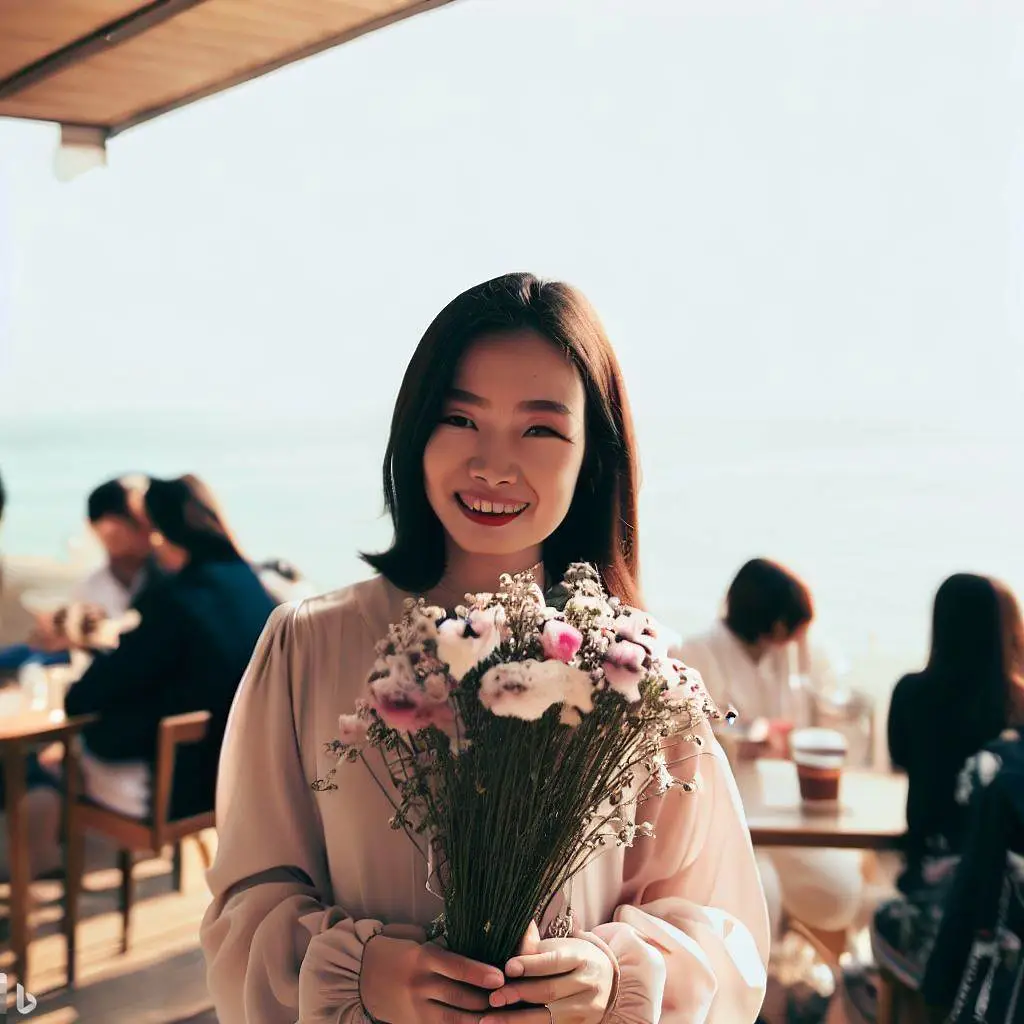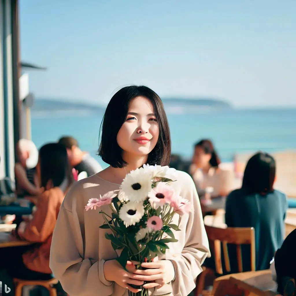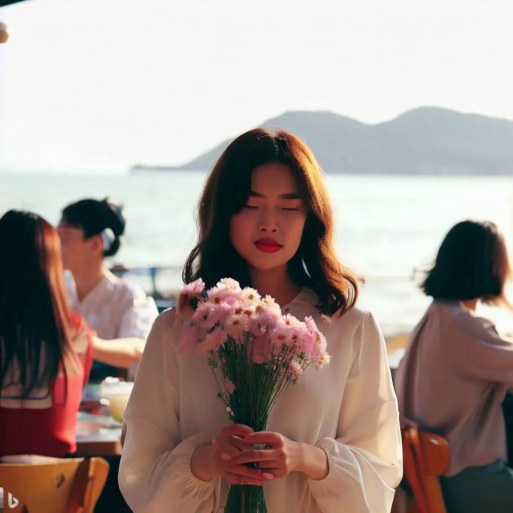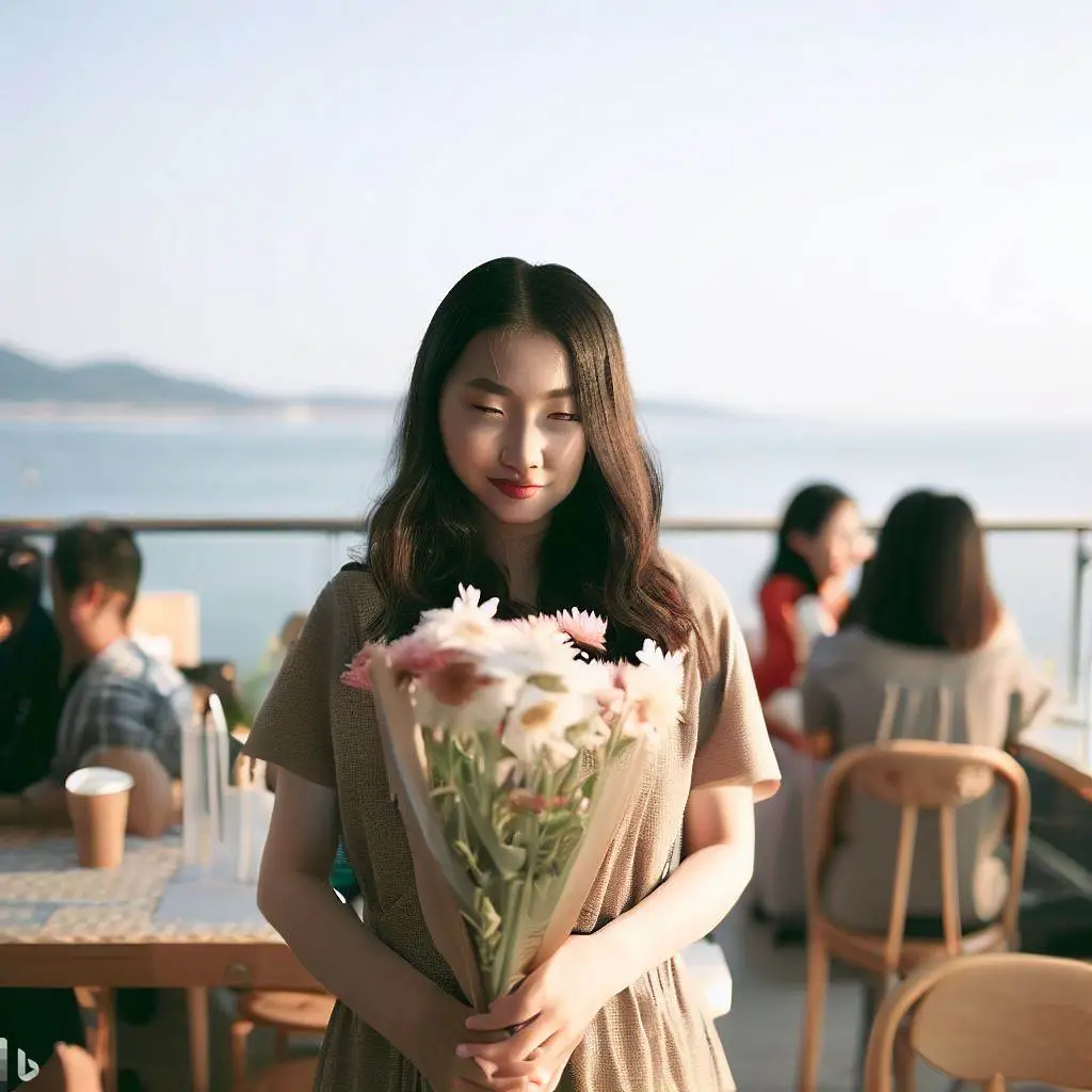 바닷가 옆 사람이 많은 카페에 꽃을 든 한국인 여자를 그려줘