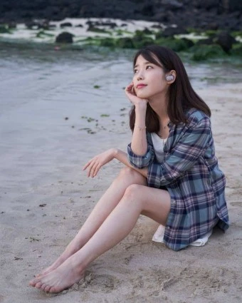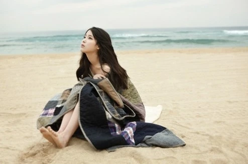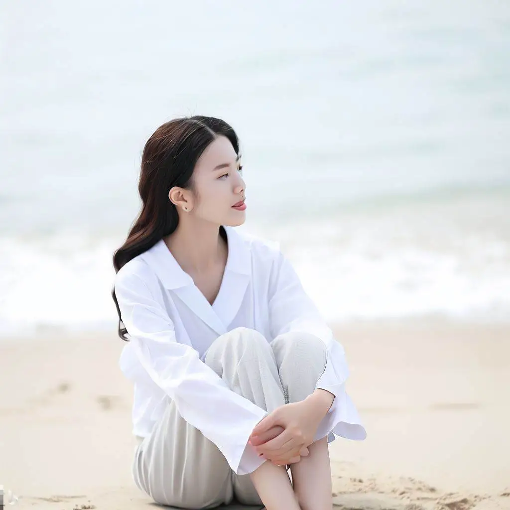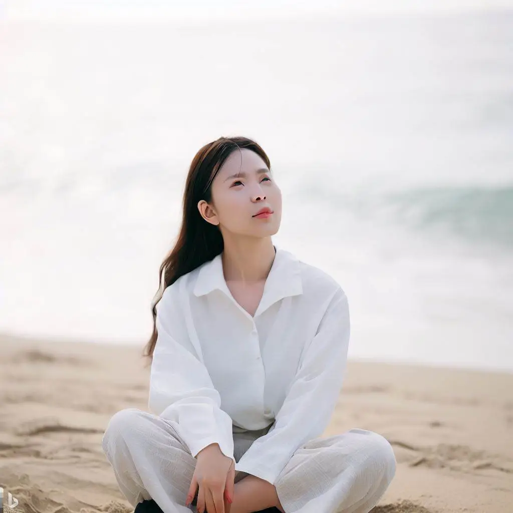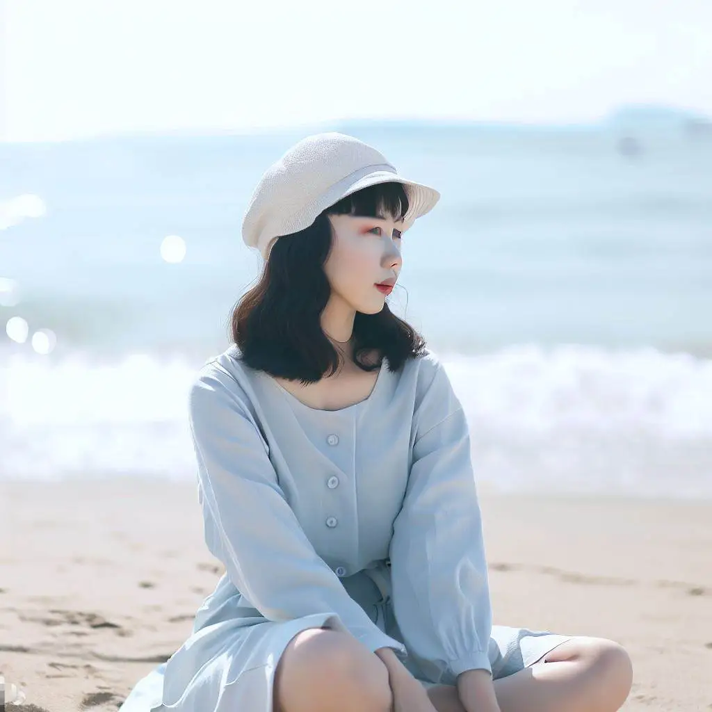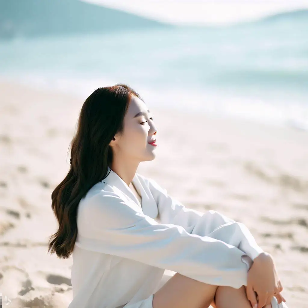 바닷가에 앉아있는 한국인 여자 그려줘
