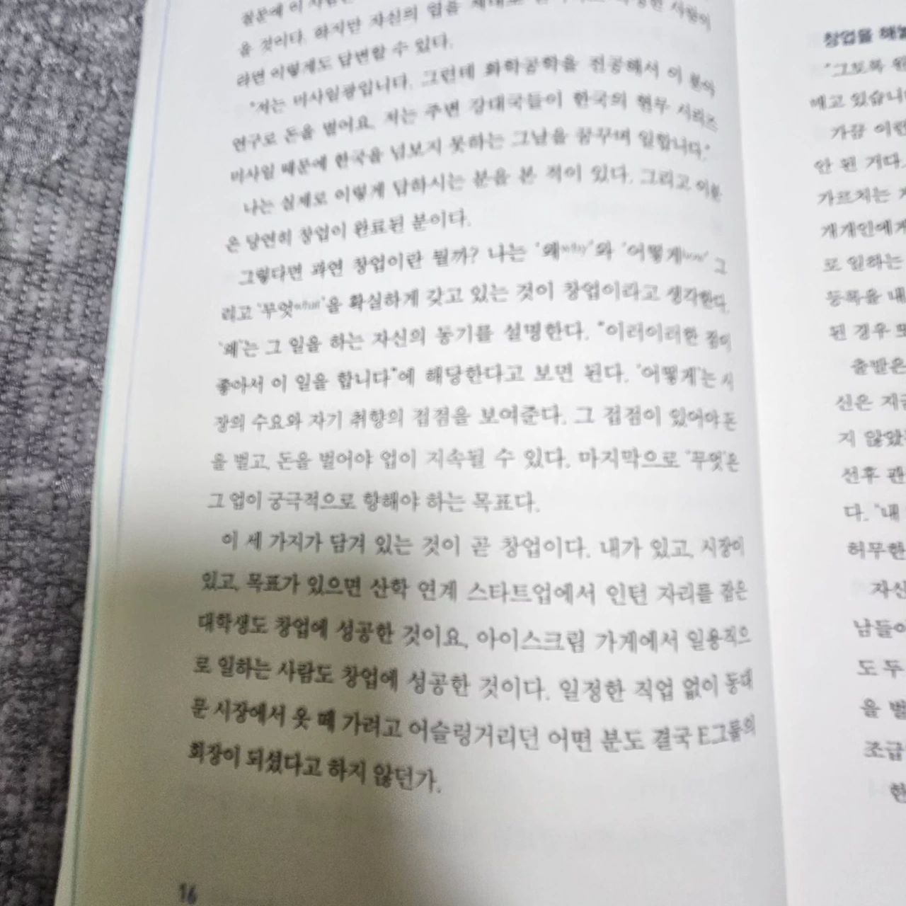 작가에 따르면 한국인 대부분은 업이 아닌 직을 쫒는다 했다. 직장이 아닌 내가 평생 추구하는 일의 테마인 업을 시작하는 것이 작가가 말하는 창업이다. '왜' '어떻게' '무엇'을 확실히 가지고 있는 것이 창업이다. 내가 있고, 시장이 있고, 목표가 있으면, 대학생이든 아이스크림 가게 일용직이든, 창업이다.