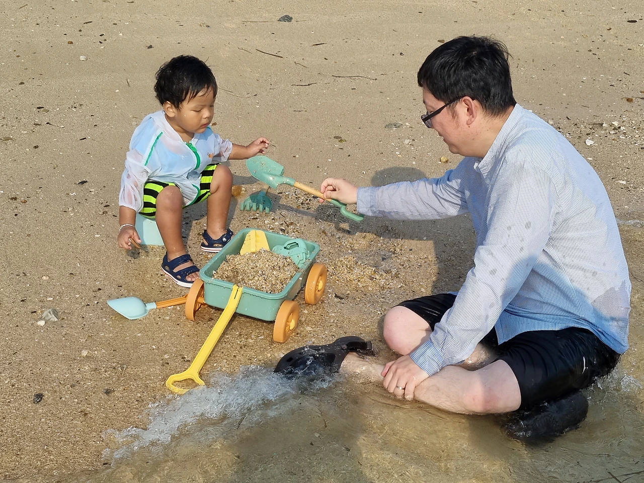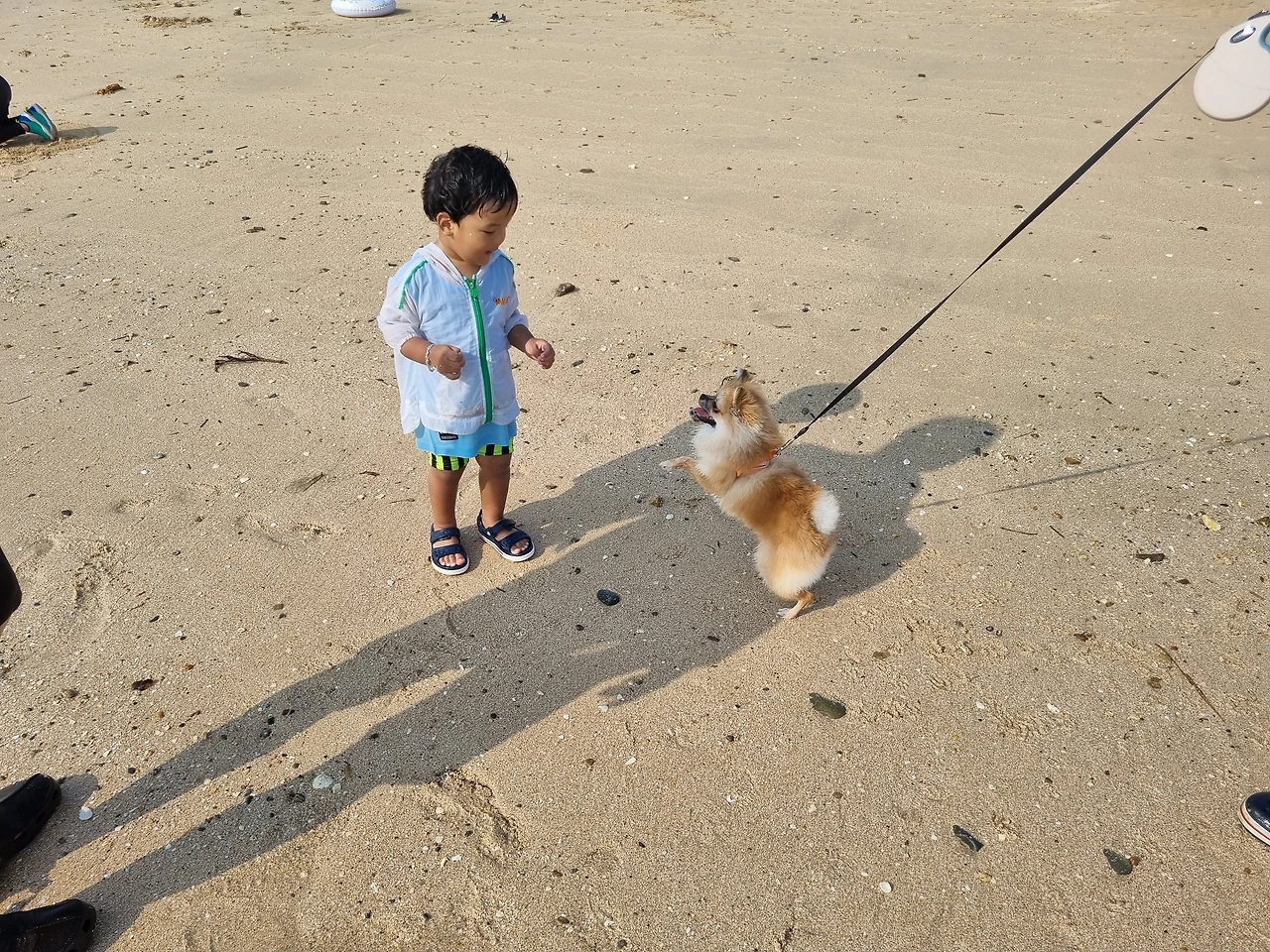 9월에 두 돌 되는 아들 요한이가 물놀이는 몇 번 했는데, 바다수영은 처음이다. 처음에는 무서웠는지 울다가, 바다에 드러눕기도 하고, 지 힘으로 헤엄쳐 보기도 하고, 모래놀이도 했다.