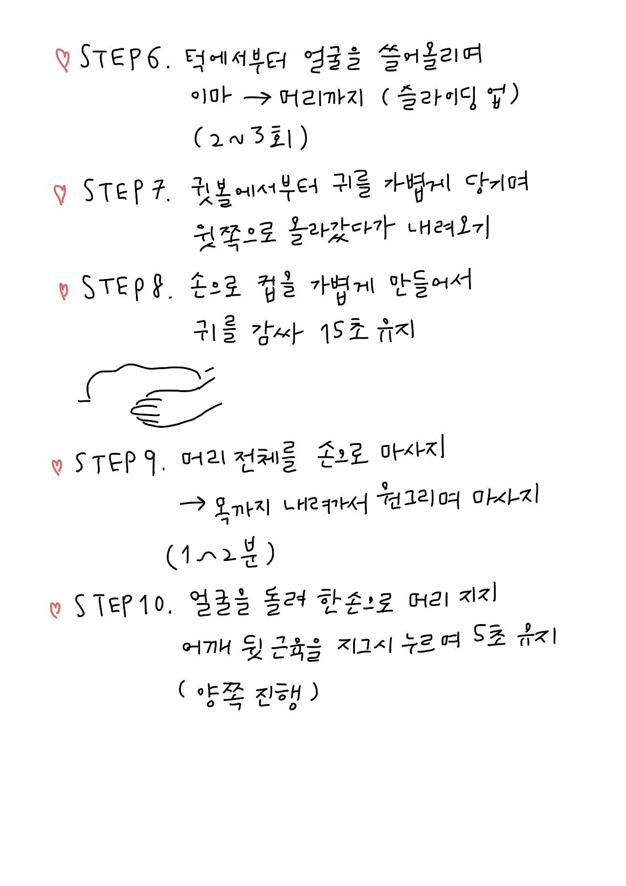 일곱 번째, 귓불에서부터 귀를 가볍게 당기며 위쪽으로 올라갔다가 내려오고