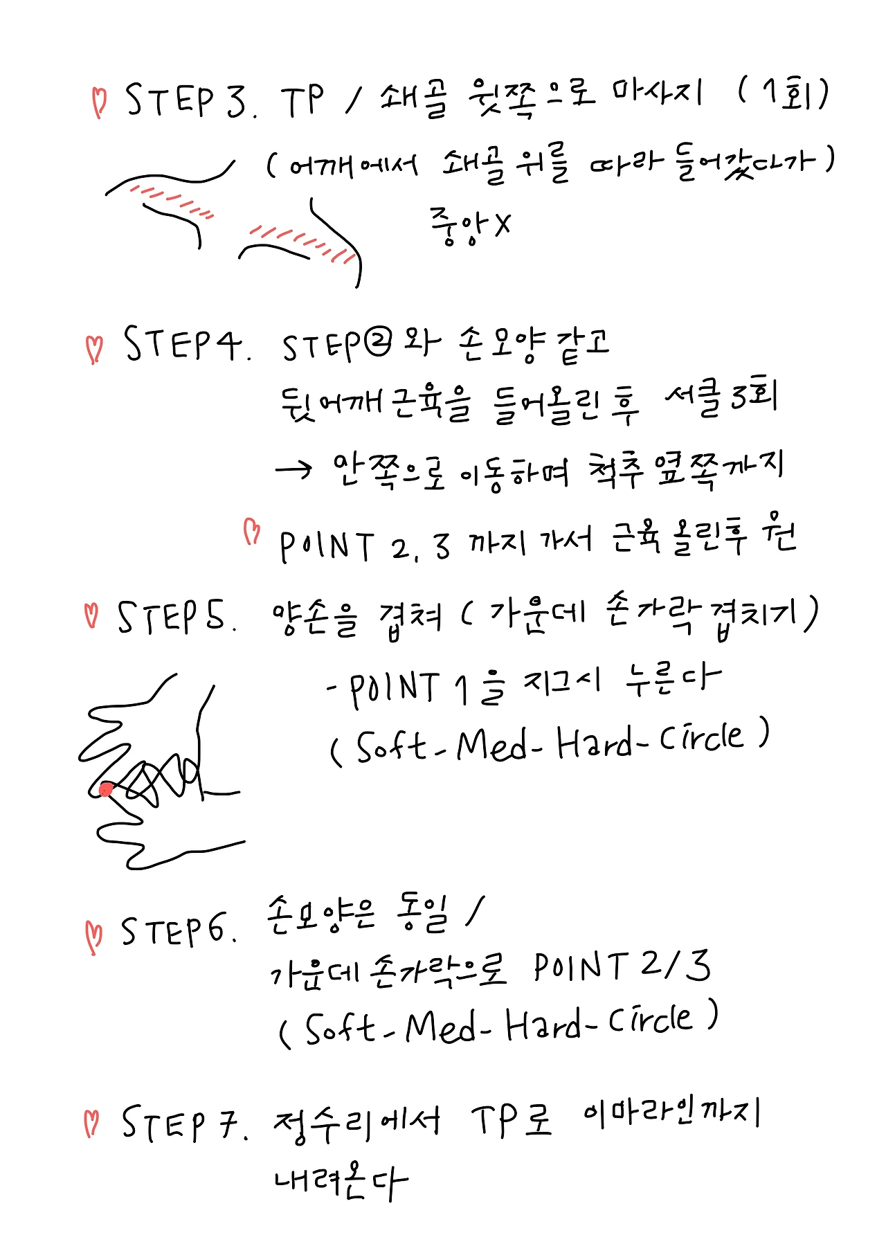 다음으로는 위의 어깨 뒤쪽 마사지와 손 모양은 같으나 뒷 어깨 근육을 들어 올린 후, 3회 정도 원을 그리며