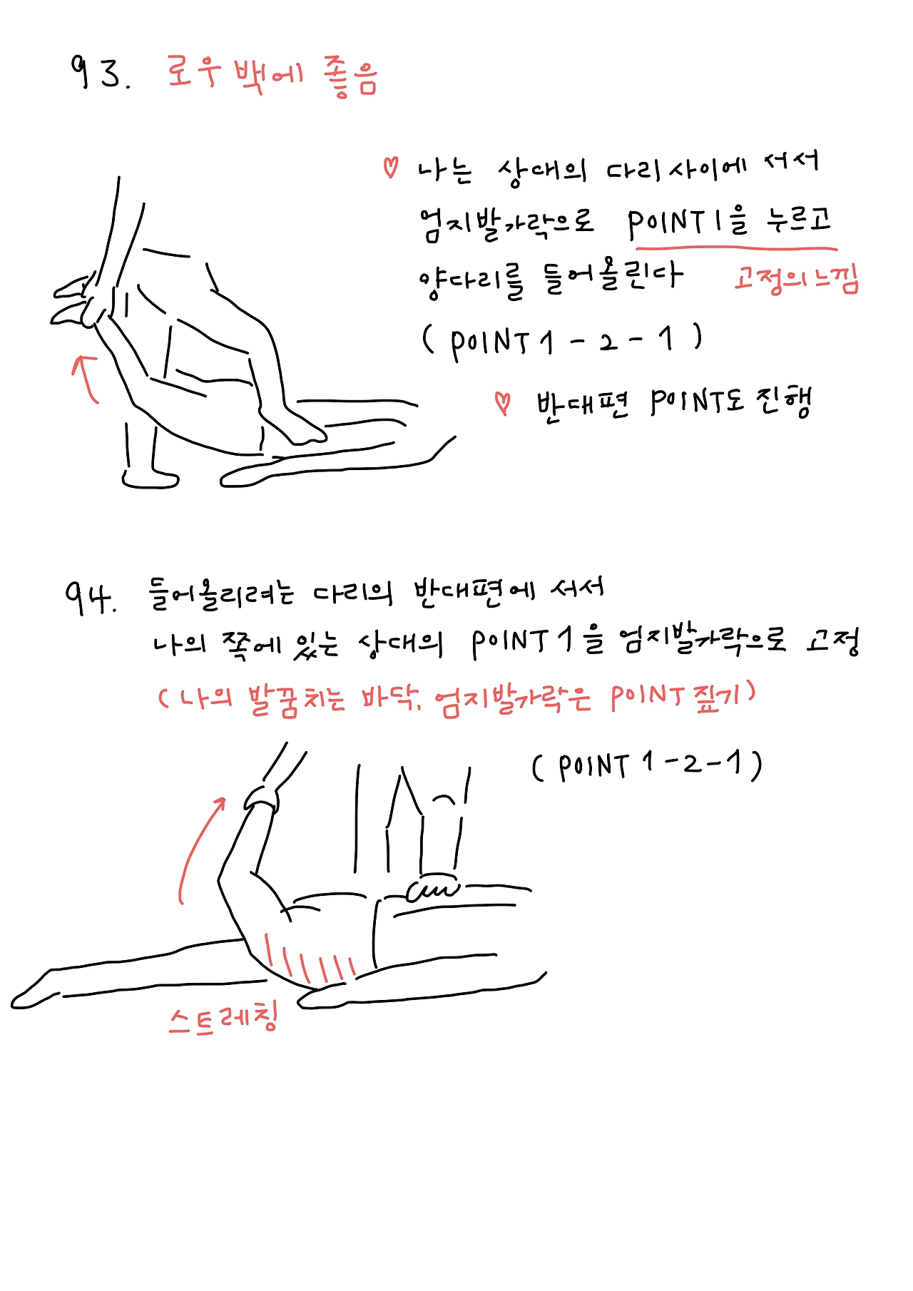 다음은 상대의 다리 사이에 서서 엄지발가락으로 상대의 포인트 1을 누르고 양다리를 들어 올린다. 1-2-1